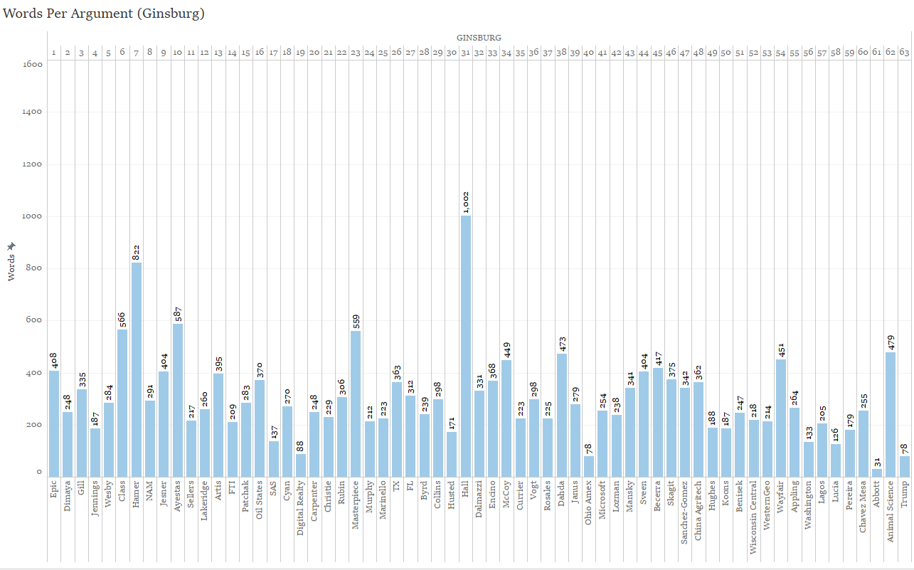 Ginsburg reached the 1,000-word marker in one argument this term – Hall v. Hall, which interestingly was just about at the midpoint for arguments this term. She added over 800 words in Hamer. On the other end of the spectrum, she only spoke 31 words in the Abbott argument.