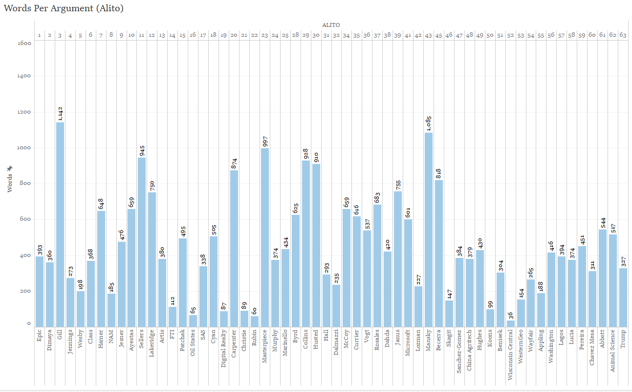 The remaining three justices who spoke during oral argument showed the greatest variation in their oral-argument speech patterns. First, Alito was often either very involved or hardly involved at all in oral arguments this term.