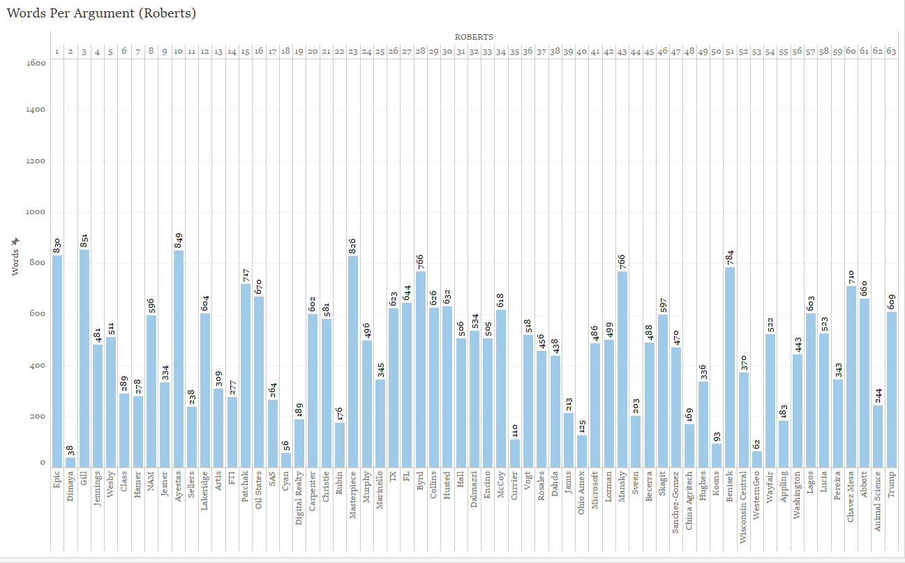 While less active across the board and with no 1,000-word arguments, Roberts was fairly consistent in his participation at either a moderate or low level during most oral arguments.