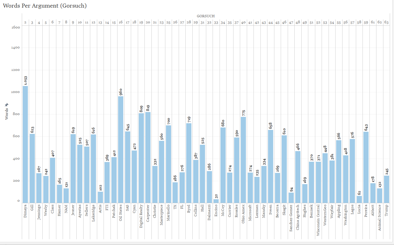 The lead speaker at oral arguments for the past several terms, Breyer, once again was the most active speaker by a large margin. Sotomayor and Kagan have also helped lead the way in terms of the justices’ speech over the past several terms. While Justice Antonin Scalia was not the most gregarious of justices at oral argument at least in terms of total word output, Gorsuch seems to be lagging behind Scalia’s model. Gorsuch was the justice to average the third fewest words per argument in which he participated.