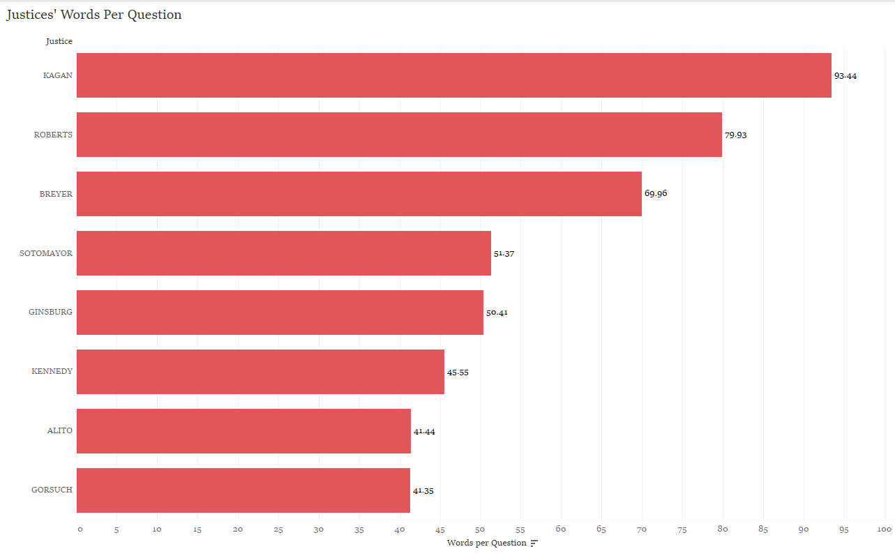 The justices at the top of the figure tend to say a lot relative to the number of questions they ask. In this respect they may be seeking different types of information than some of the other justices. Given that Kennedy and Ginsburg speak the least at oral argument, they appear to efficiently choose when to engage. Alito and Gorsuch speak the fewest words per question, indicating that they tend to frame their speaking turns around questions. These two justices are also exceptionally close in their words-to-questions ratios, which may be meaningless or may mean they have similar goals for oral argument.