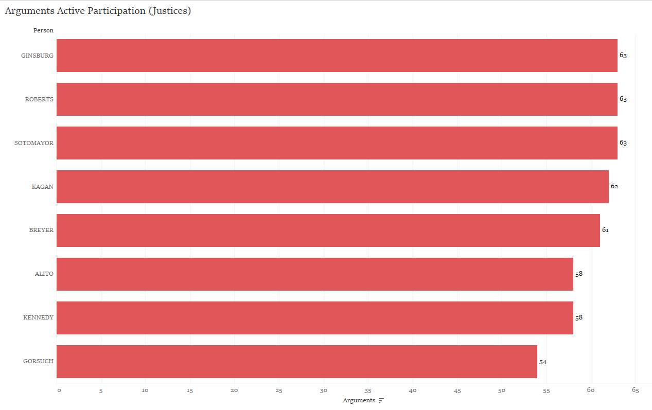 Unlike particular attorneys, Supreme Court justices are engaged in each oral argument over the course of the term. Even the reticent Thomas is often caught perusing briefs while on the bench. Still, not all justices are equally engaged and their type of engagement varies as well.