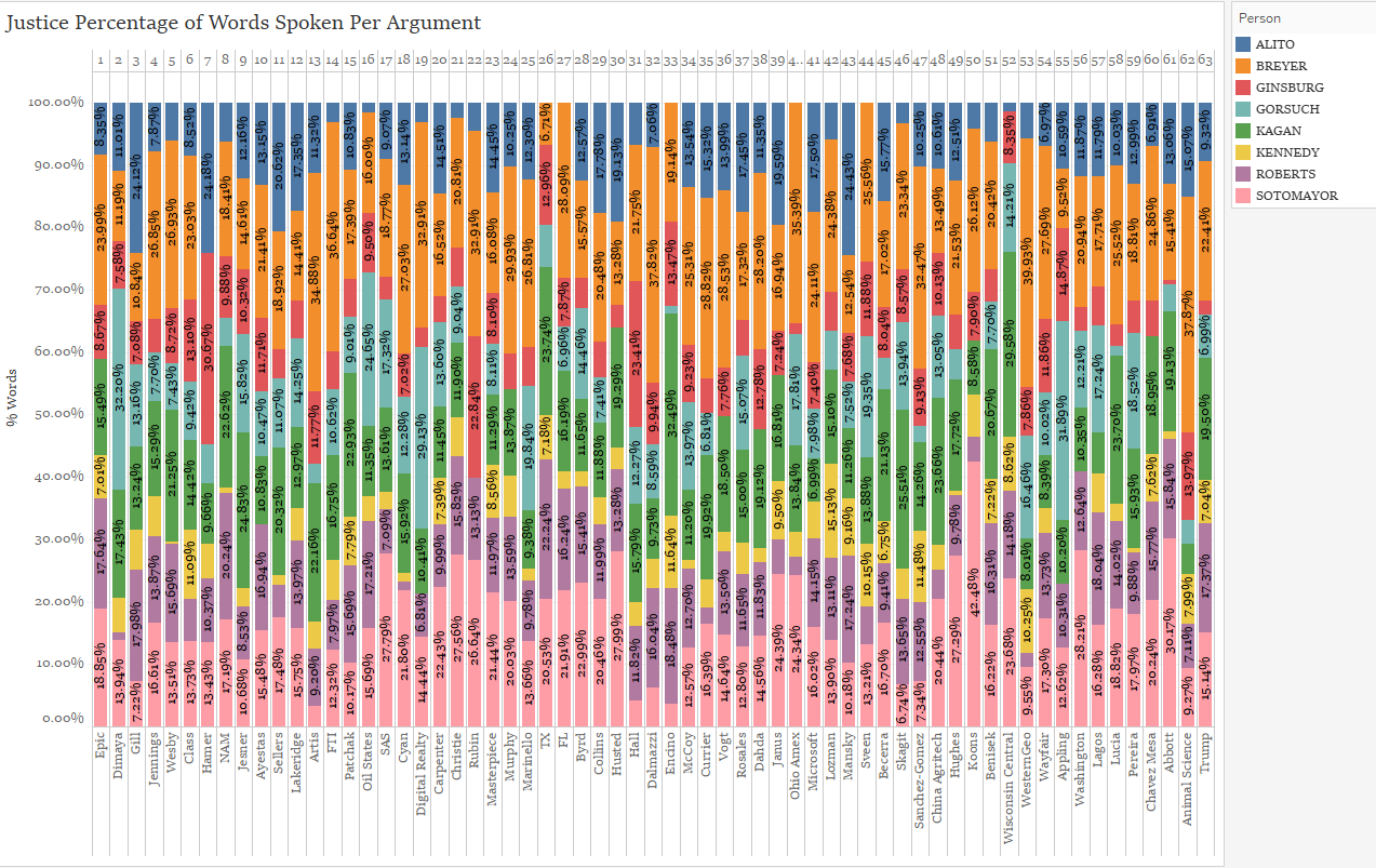 This justice-level participation can be broken down further into individual arguments. The following graph shows the justices’ relative contributions by percent to the total words spoken by all justices at each oral argument. The arguments are ordered chronologically by argument day.