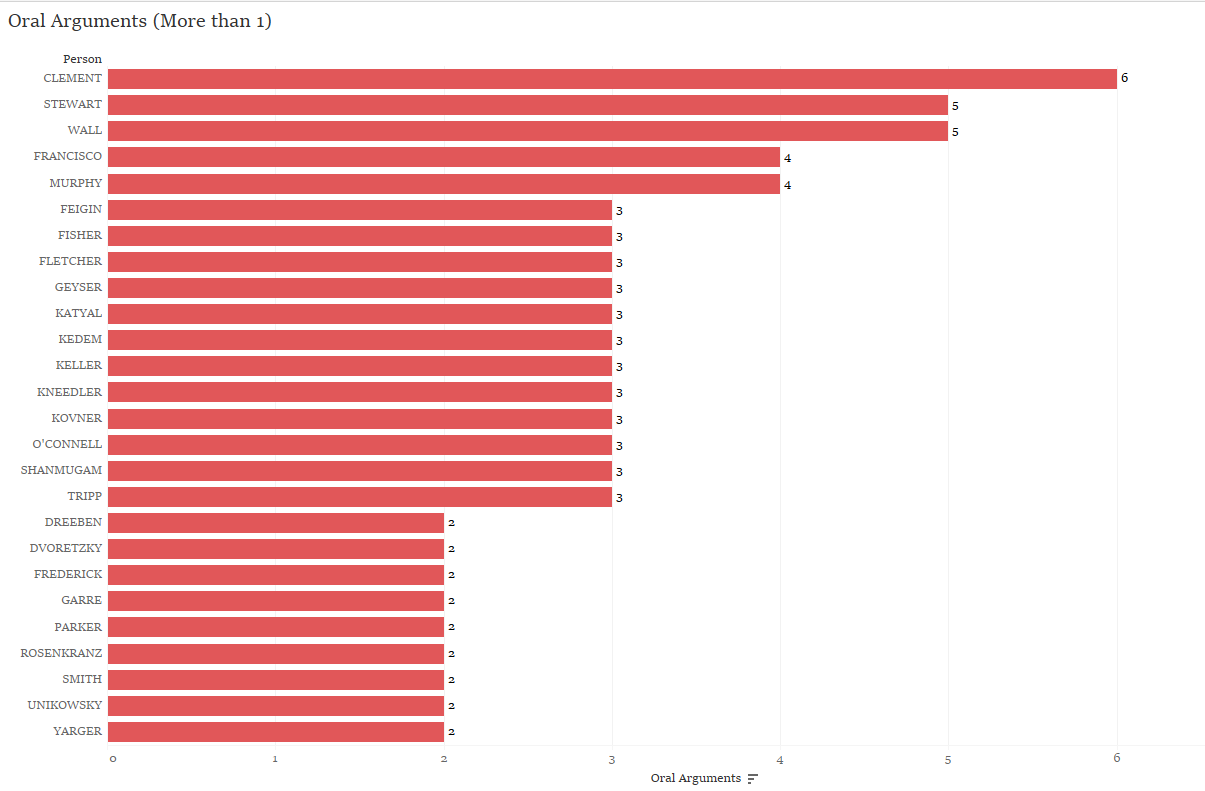 Private attorney Paul Clement participated in the most oral arguments, followed by government attorneys Jeffrey Wall and Malcolm Stewart. Even though individual attorneys only participated in a modicum of arguments across the term compared to the justices, some were able to contribute quite significantly in these limited instances.