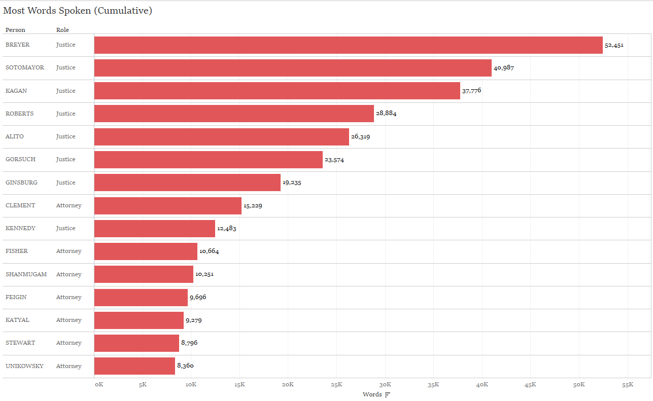 When we look at the top speakers’ (justices and attorneys) cumulative words spoken across the term, we see that several attorneys are in the mix.