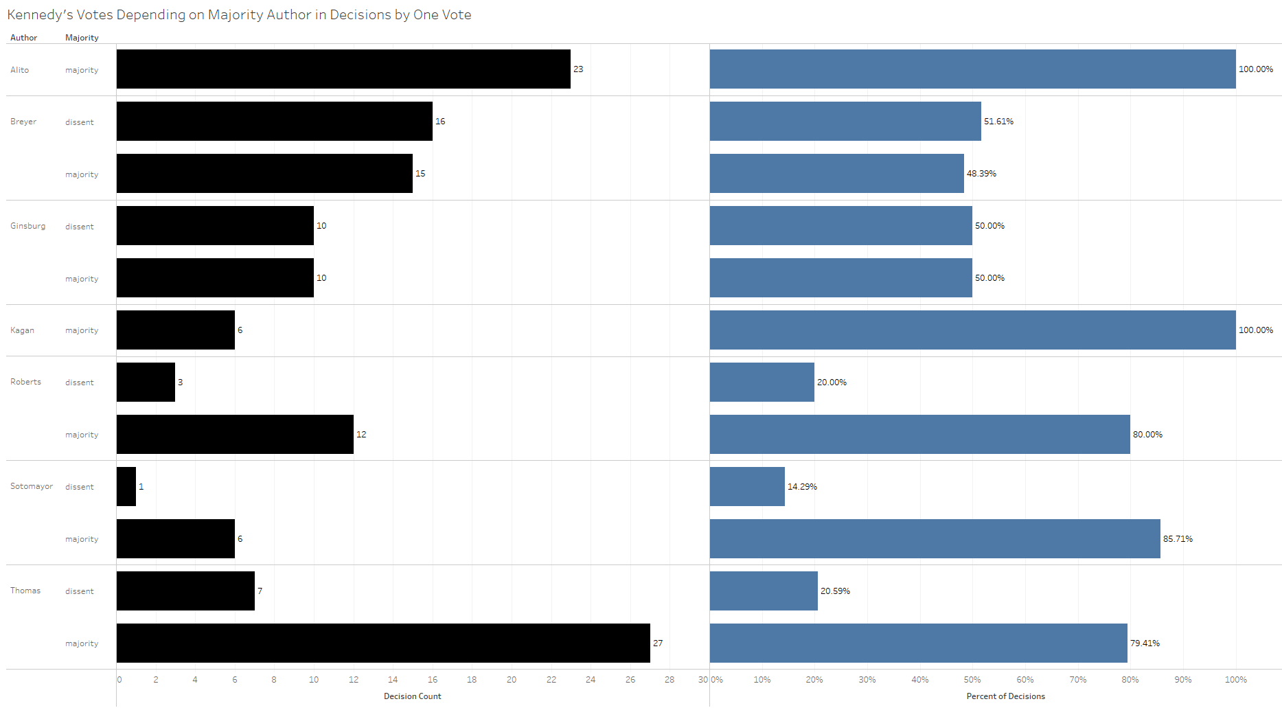 While Kennedy was only in the majority when both Justice Samuel Alito and Kagan authored such decisions, he was much more likely to side with a Roberts or Thomas opinion than he was to side with a Ginsburg or Breyer opinion (Alito also wrote many more such decisions than Kagan).