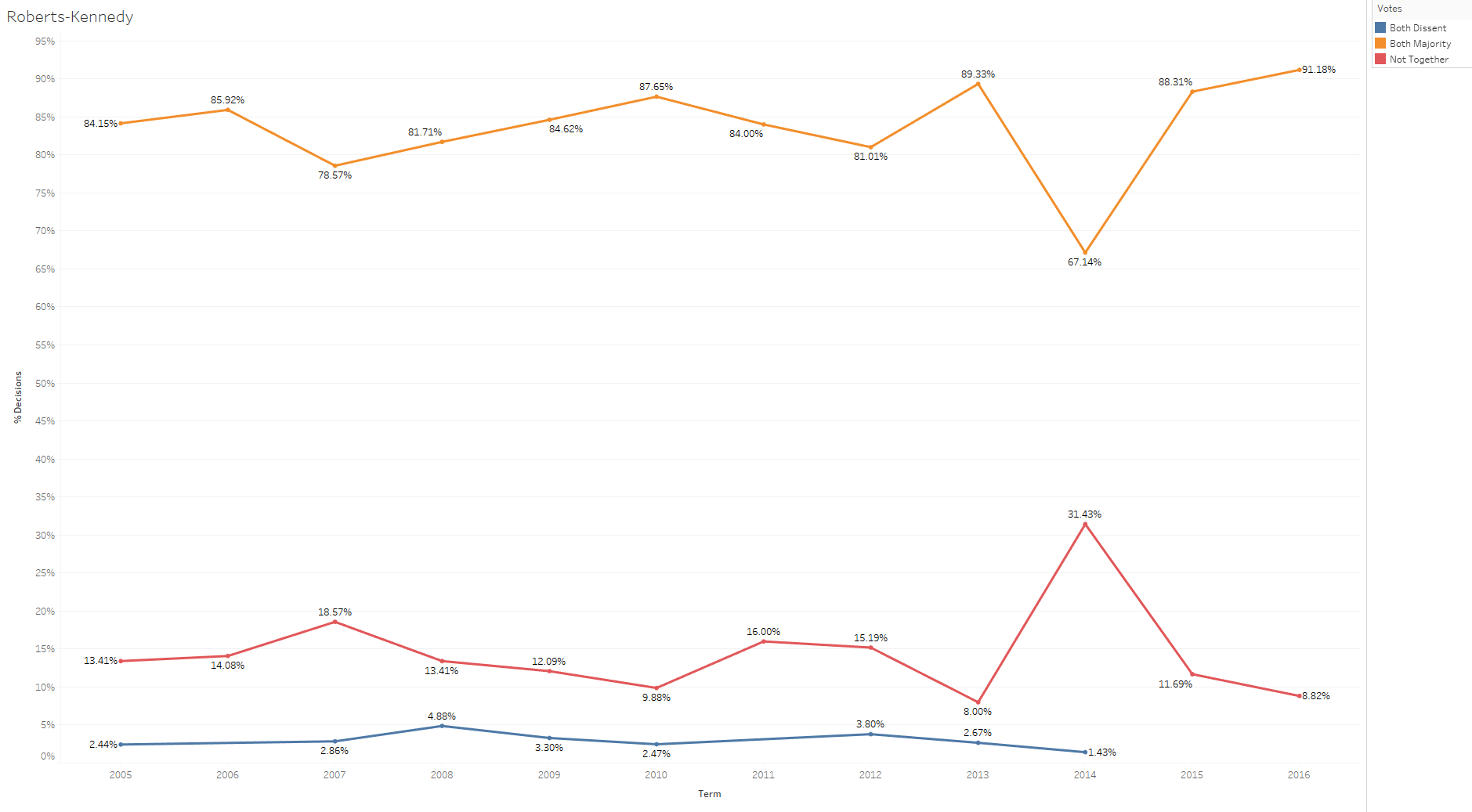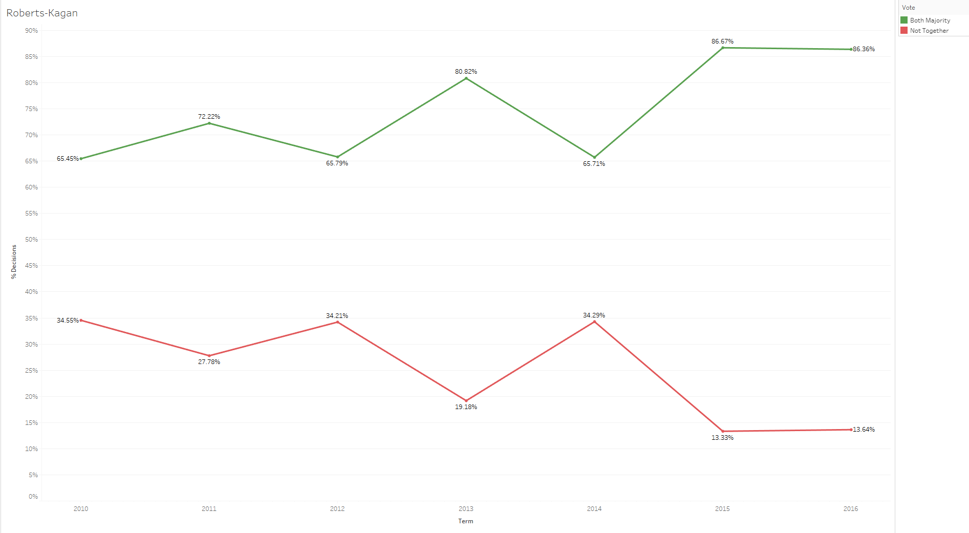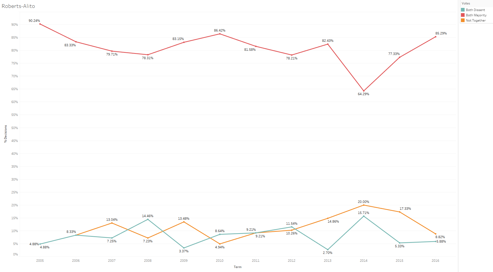 These two justices have dissented together in limited instances over the years. Their level of agreement, although increasing in recent years, falls below those of Roberts with either Kagan or Breyer. The increase appears rather to track the upward movement of the justices’ unanimous voting rate. We may see an increasing fragmentation of these two justices if the court’s polarization increases with the addition of a new justice.