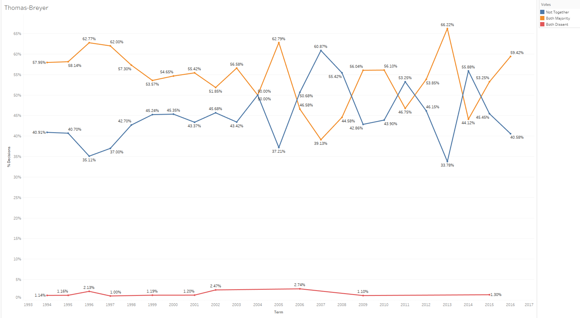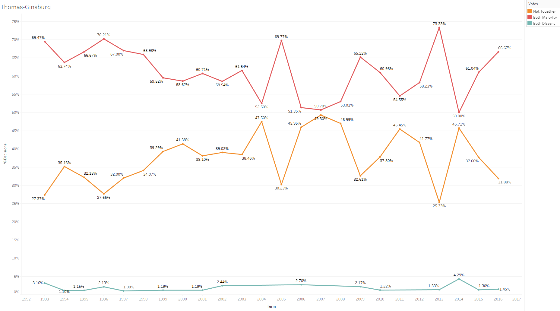 Thomas and Ginsburg’s level of agreement is also somewhat inconsistent, although it tends to hover above that of Thomas and Breyer. These two also occasionally dissent together and do this a bit more often than Thomas and Breyer.