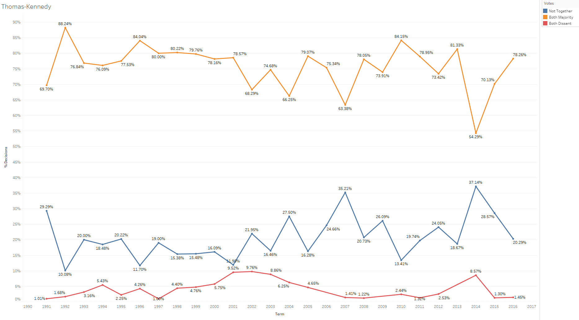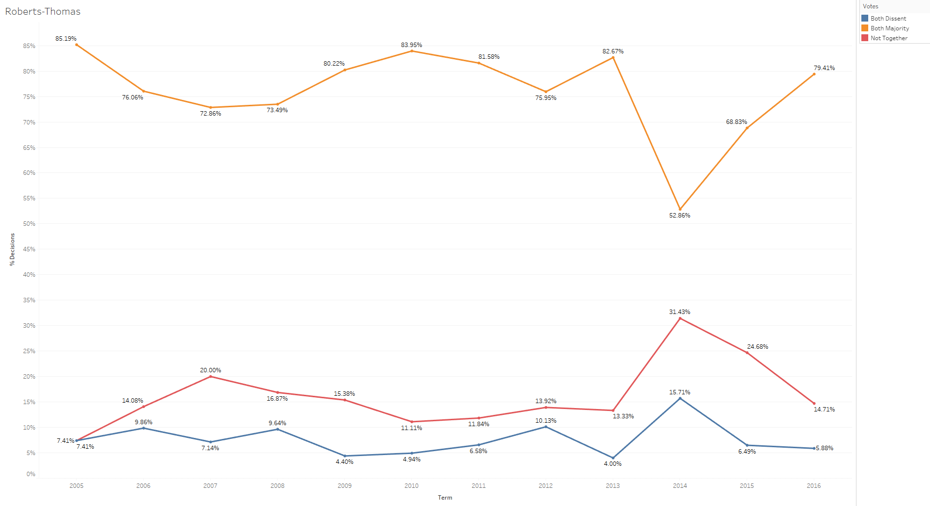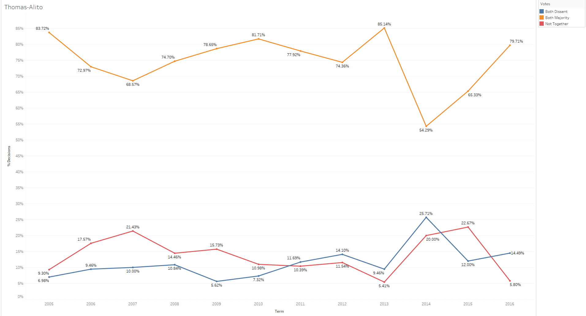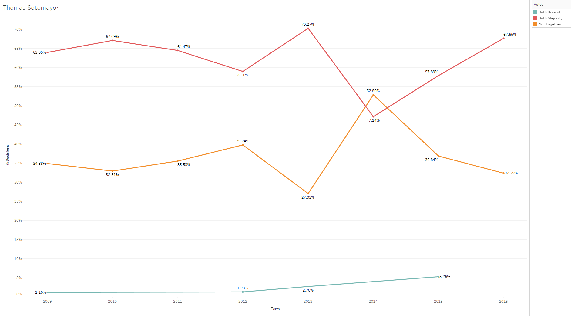 Thomas and Kagan had one term with over 70 percent agreement in the majority in 2013. They hardly ever dissent together and although their rate of agreement in the majority has increased since 2014, this moves alongside the increase in overall unanimity. Increasing polarization in the court will likely drive these two justices farther apart.