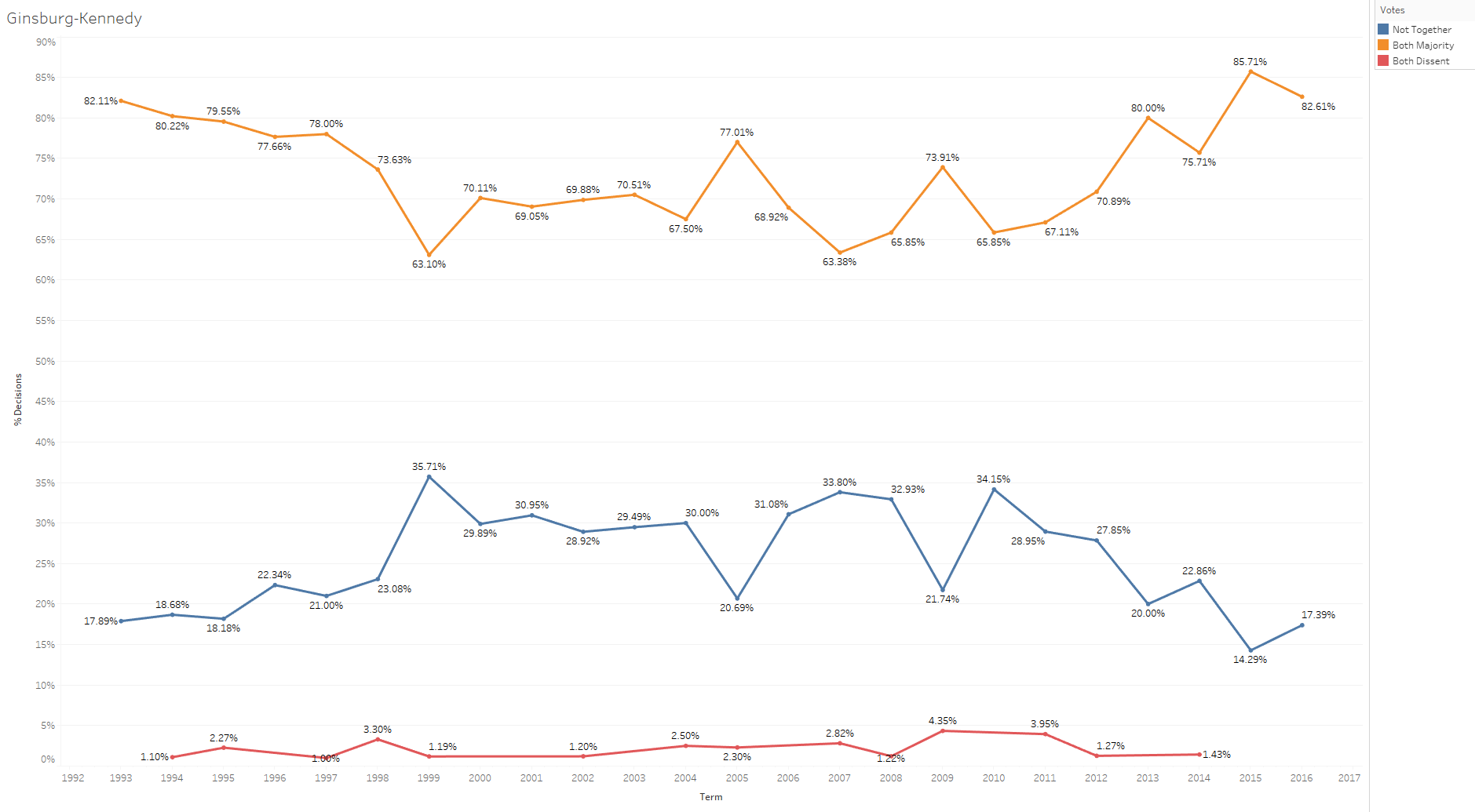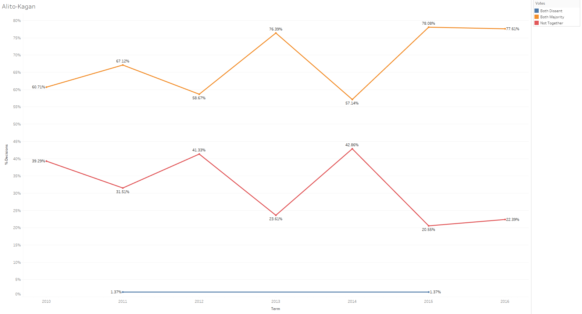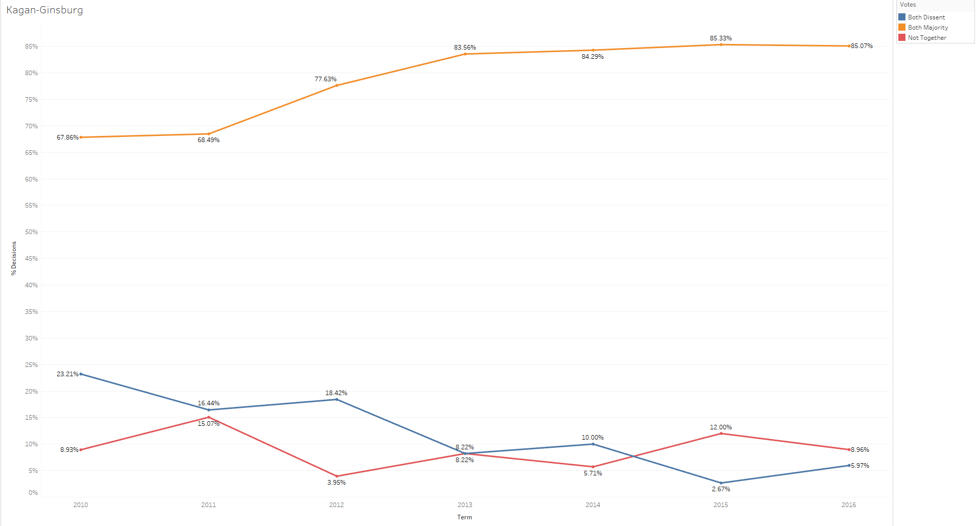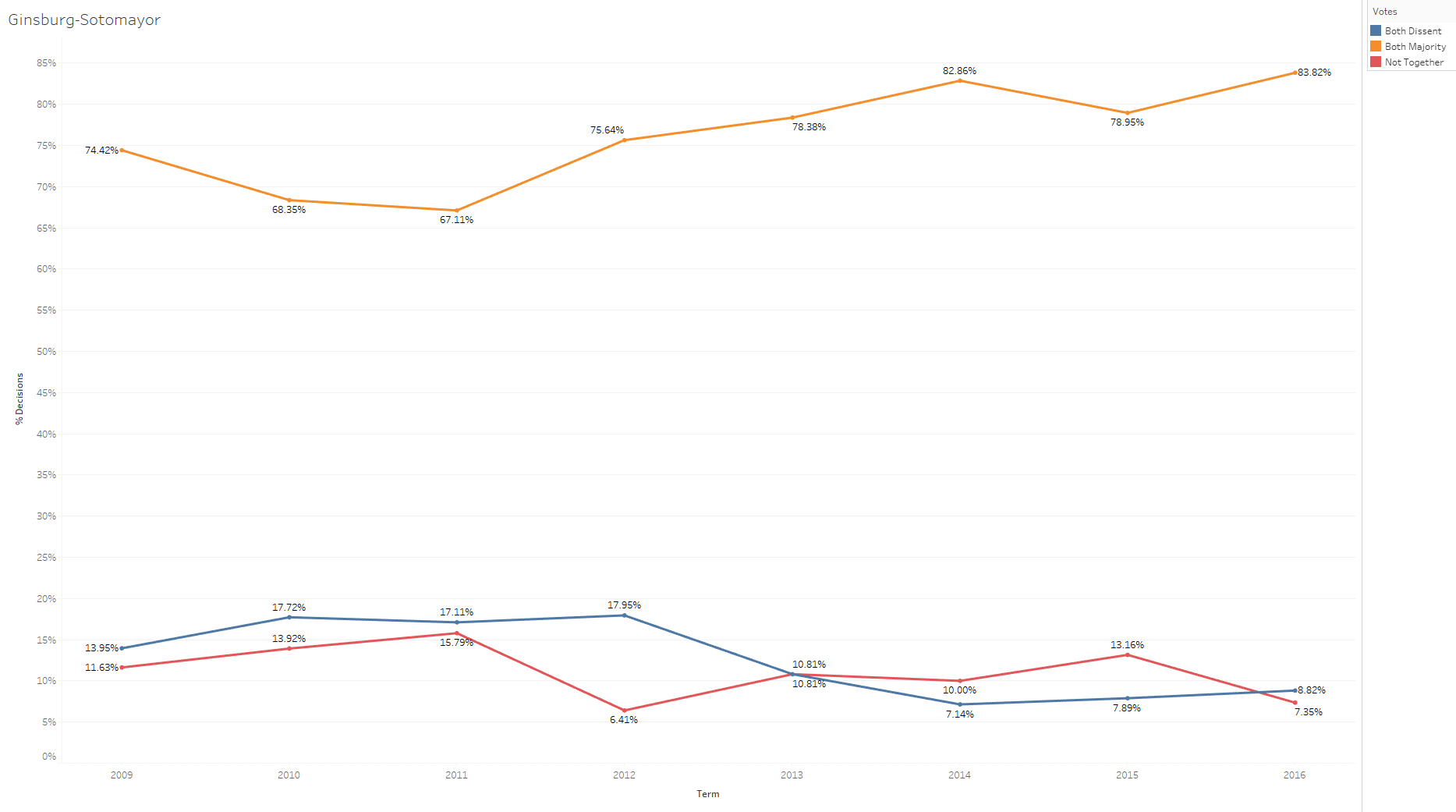 Ginsburg and Sotomayor’s level of agreement in the majority almost parallels that of Breyer and Sotomayor at a steady rate of around 80 percent. The high level of shared dissents and shared occasions in the majority hints at the likelihood that they will share a robust voting relationship on the court moving forward.