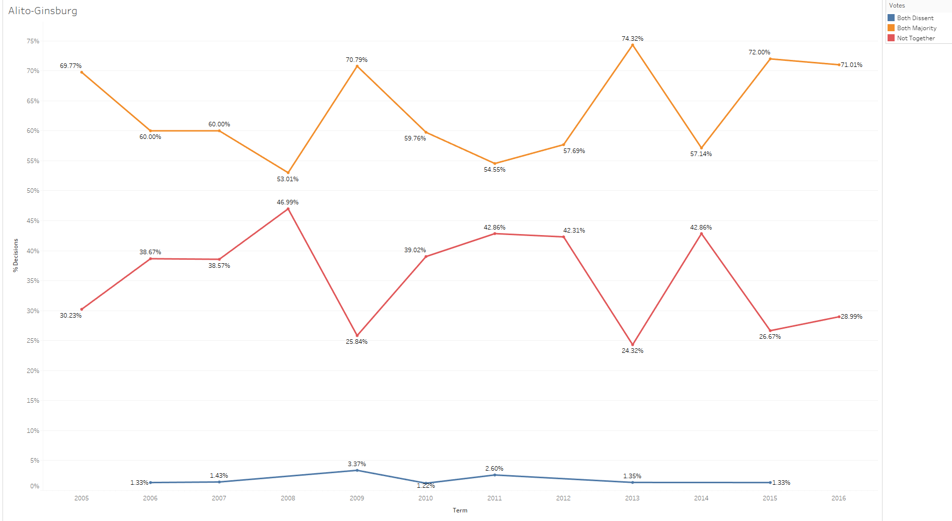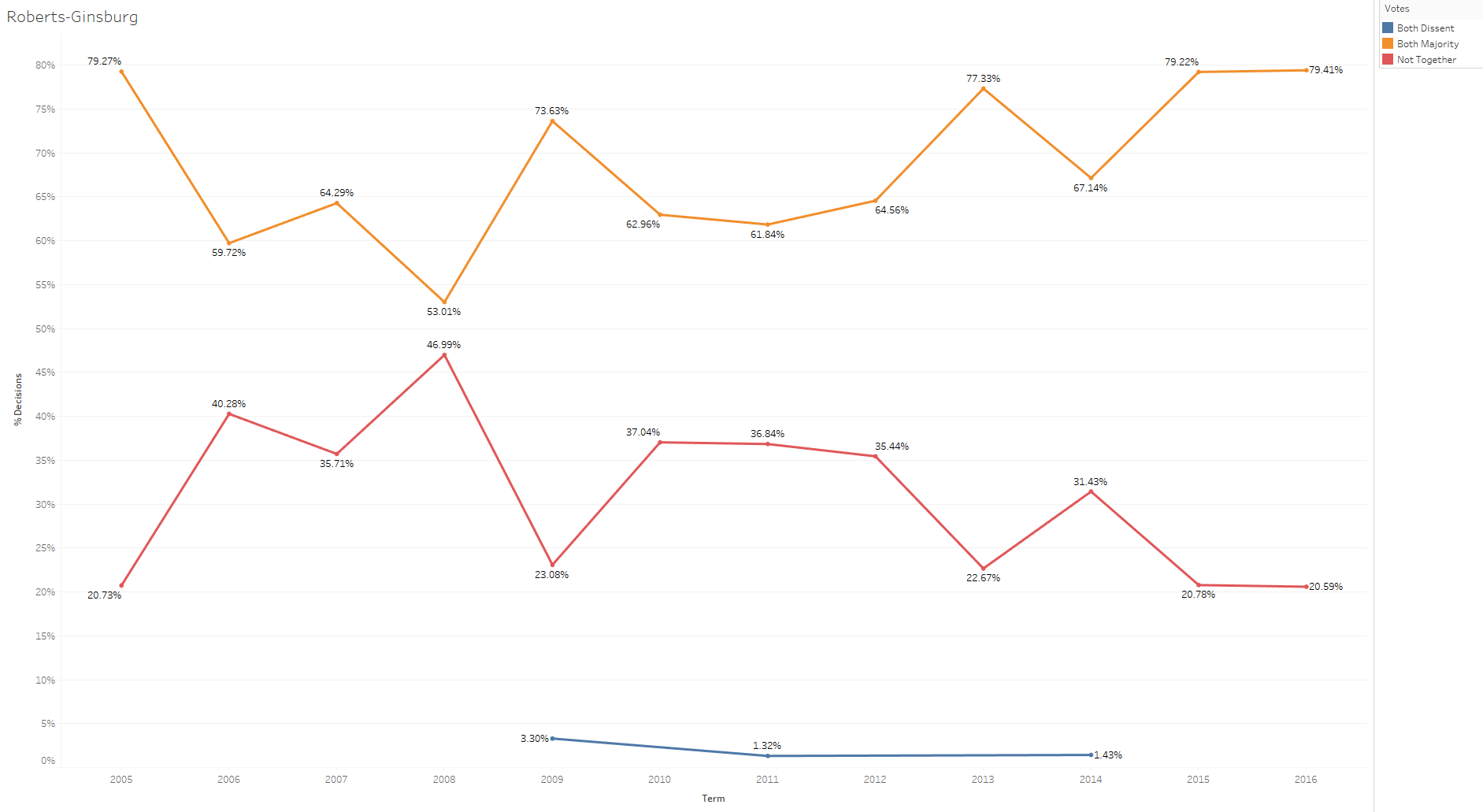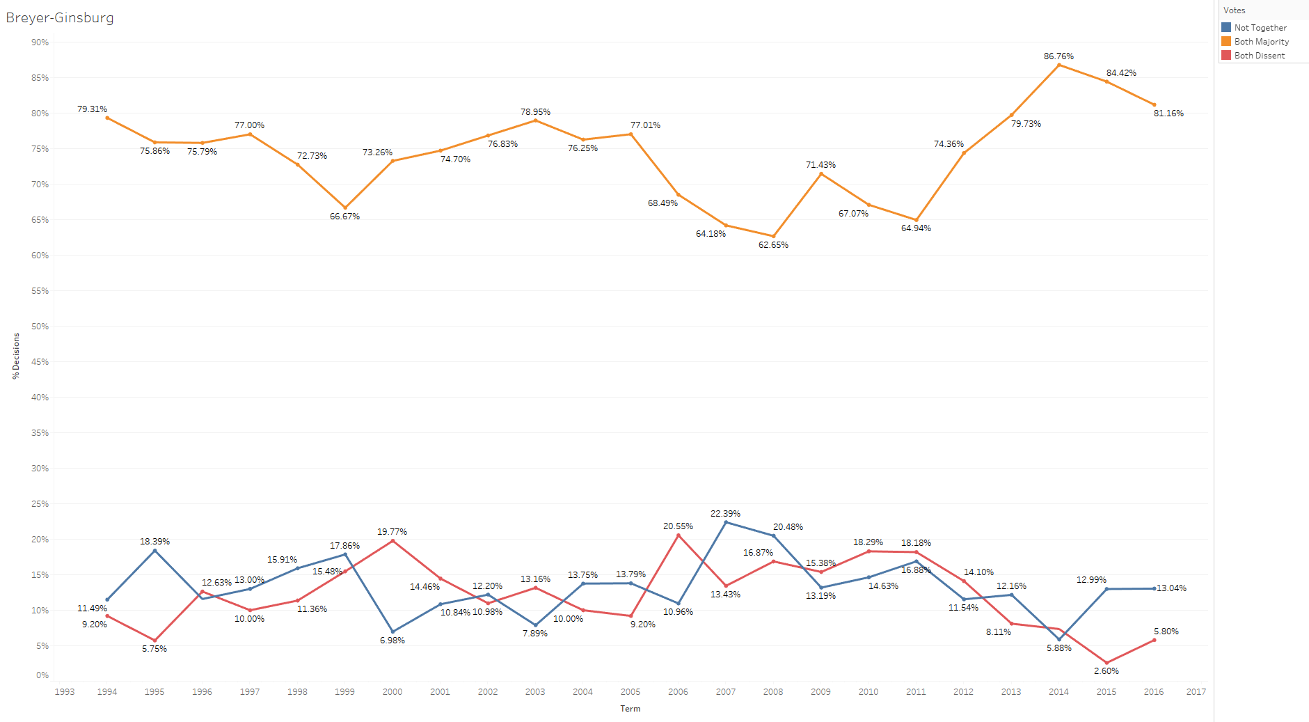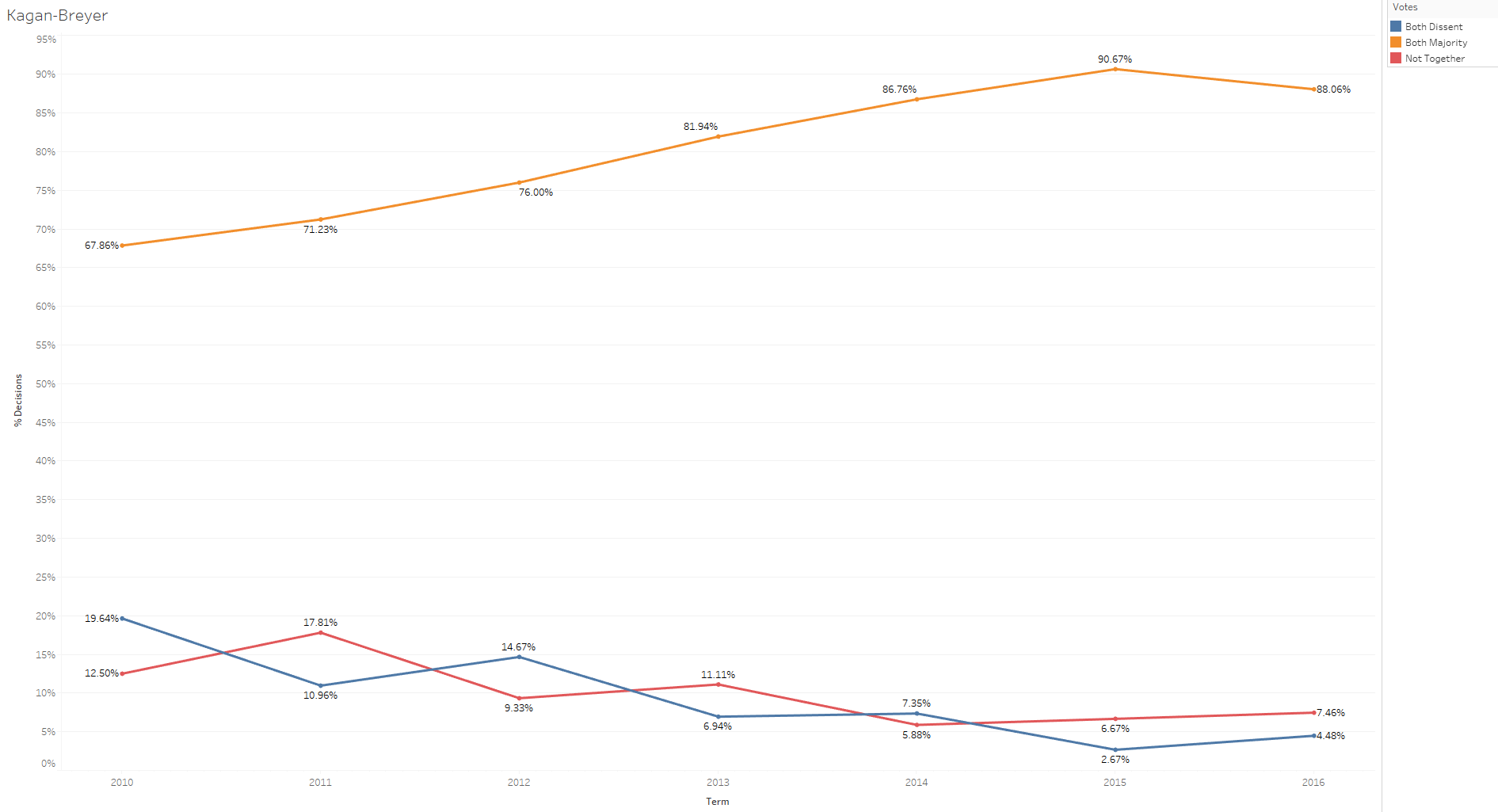 Ginsburg and Sotomayor’s level of agreement in the majority almost parallels that of Breyer and Sotomayor at a steady rate of around 80 percent. The high level of shared dissents and shared occasions in the majority hints at the likelihood that they will share a robust voting relationship on the court moving forward.