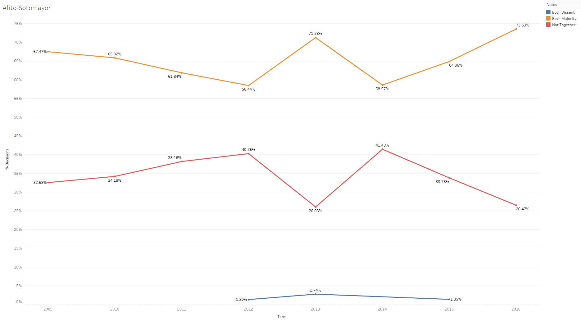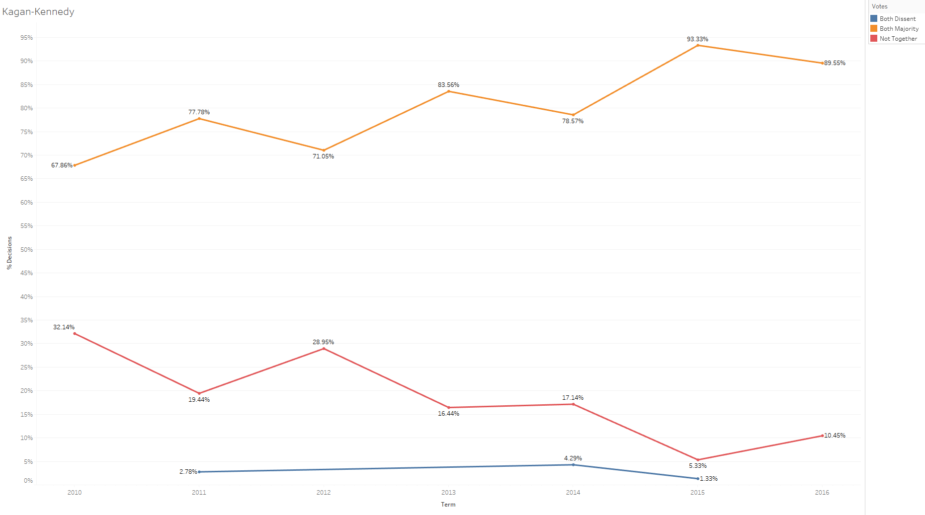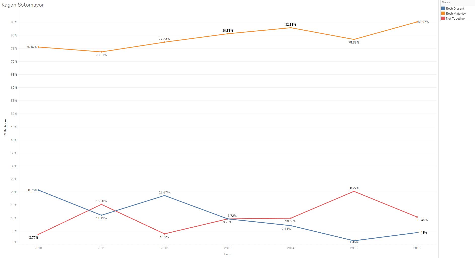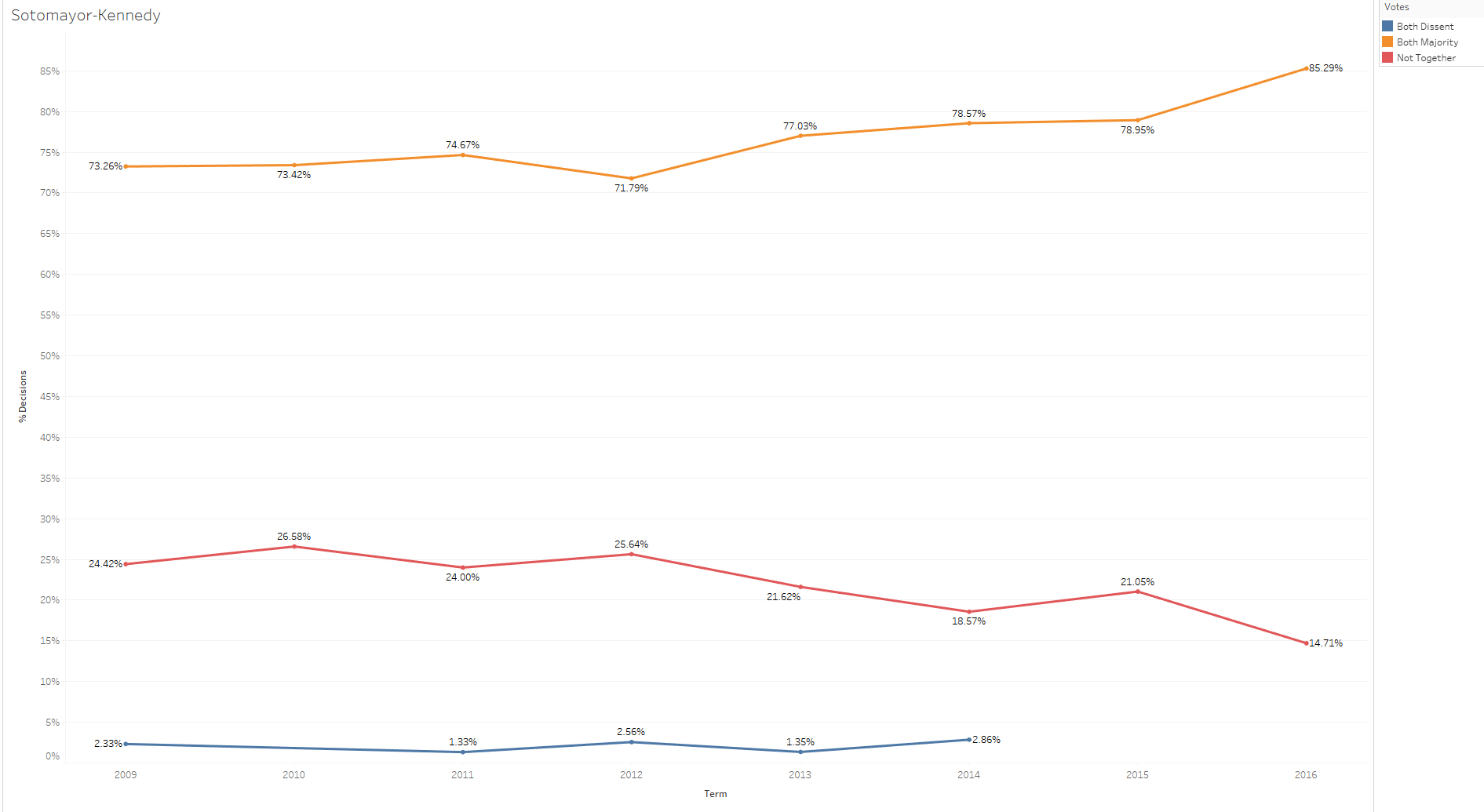 Ginsburg and Sotomayor’s level of agreement in the majority almost parallels that of Breyer and Sotomayor at a steady rate of around 80 percent. The high level of shared dissents and shared occasions in the majority hints at the likelihood that they will share a robust voting relationship on the court moving forward.