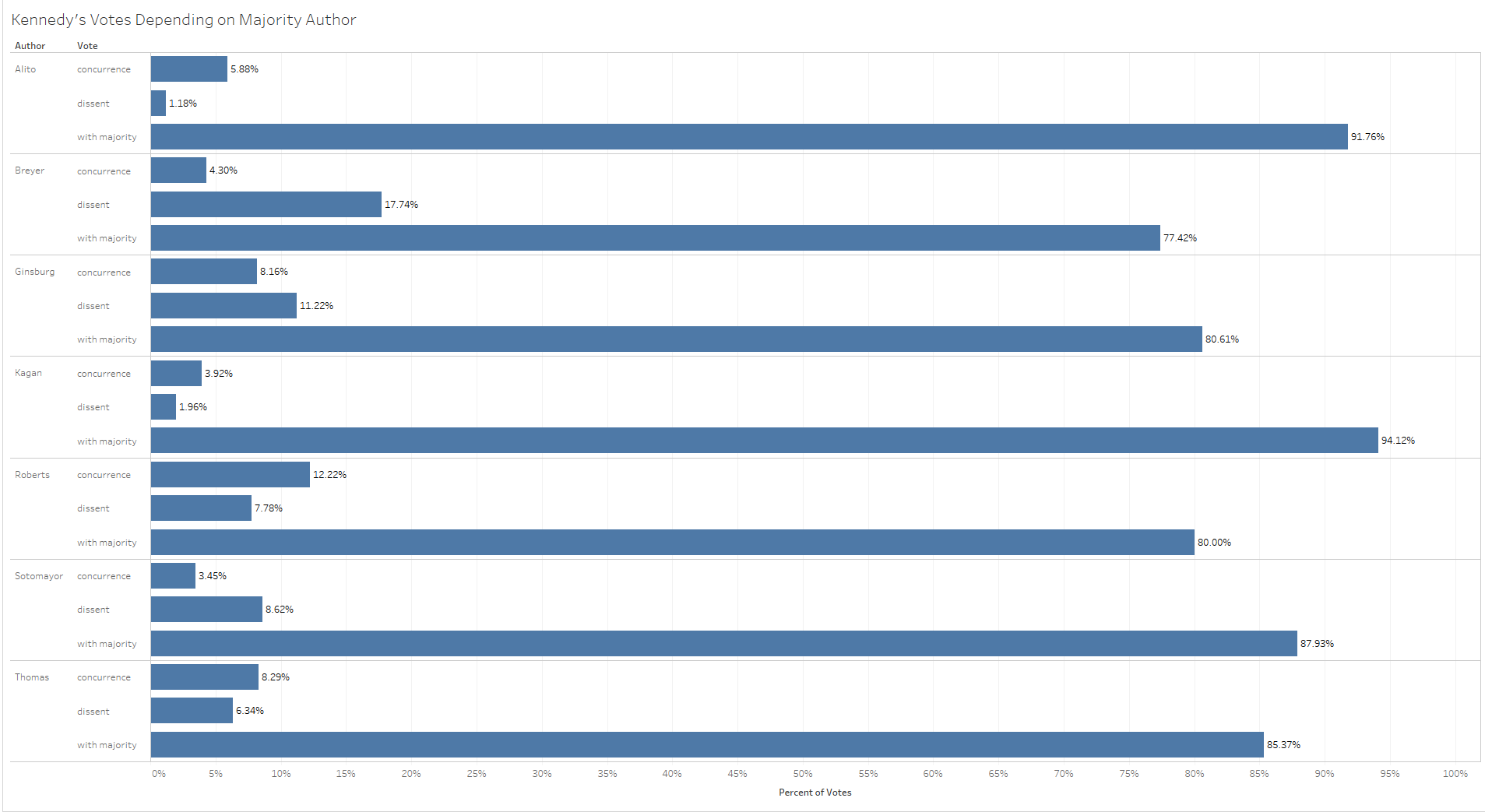 In a similar fashion, the other justices show high levels of support for Kennedy when he authors majority opinions. All of the justices’ percentages do not add up to 100 percent because of votes that are not entirely for the majority or dissent in certain cases.