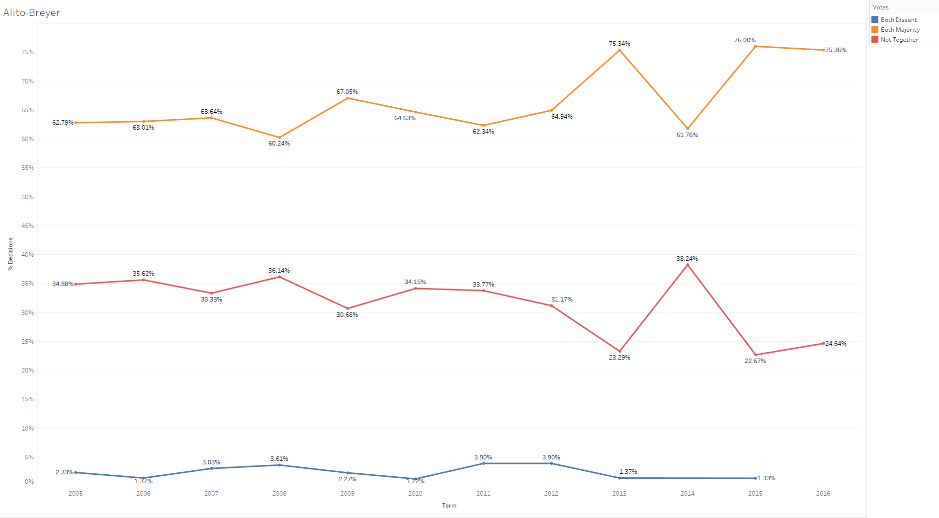 Although Alito and Breyer had a dip in their rate from 2015 to 2016, this dip was less substantial than that for Alito and Ginsburg. The Alito and Breyer consensus rate also appears much more stable than that between Alito and Ginsburg. While the Alito and Breyer dissensus rate may increase again in future terms, it will probably not rise to the levels of those between Alito and Ginsburg.