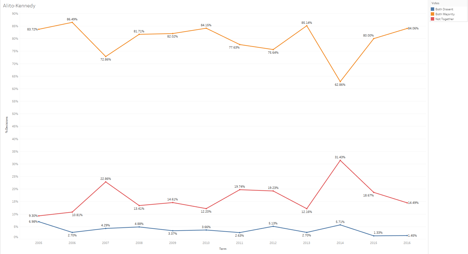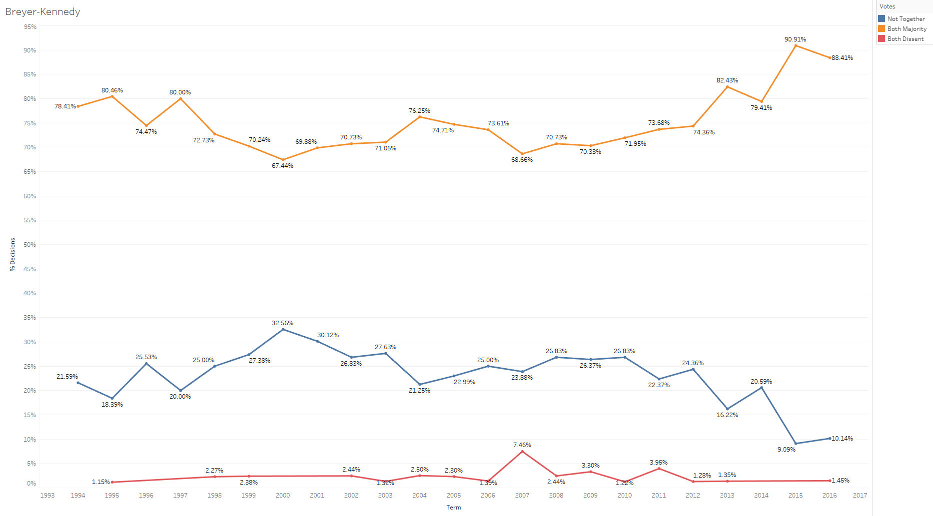 Although this pair has shown a greater likelihood of reaching consensus than the Thomas and Breyer pairing, the fluctuations in their agreement over the years shows a lack of stability that may play a greater role in diminishing their agreement if a more conservative justice takes Kennedy’s place.
