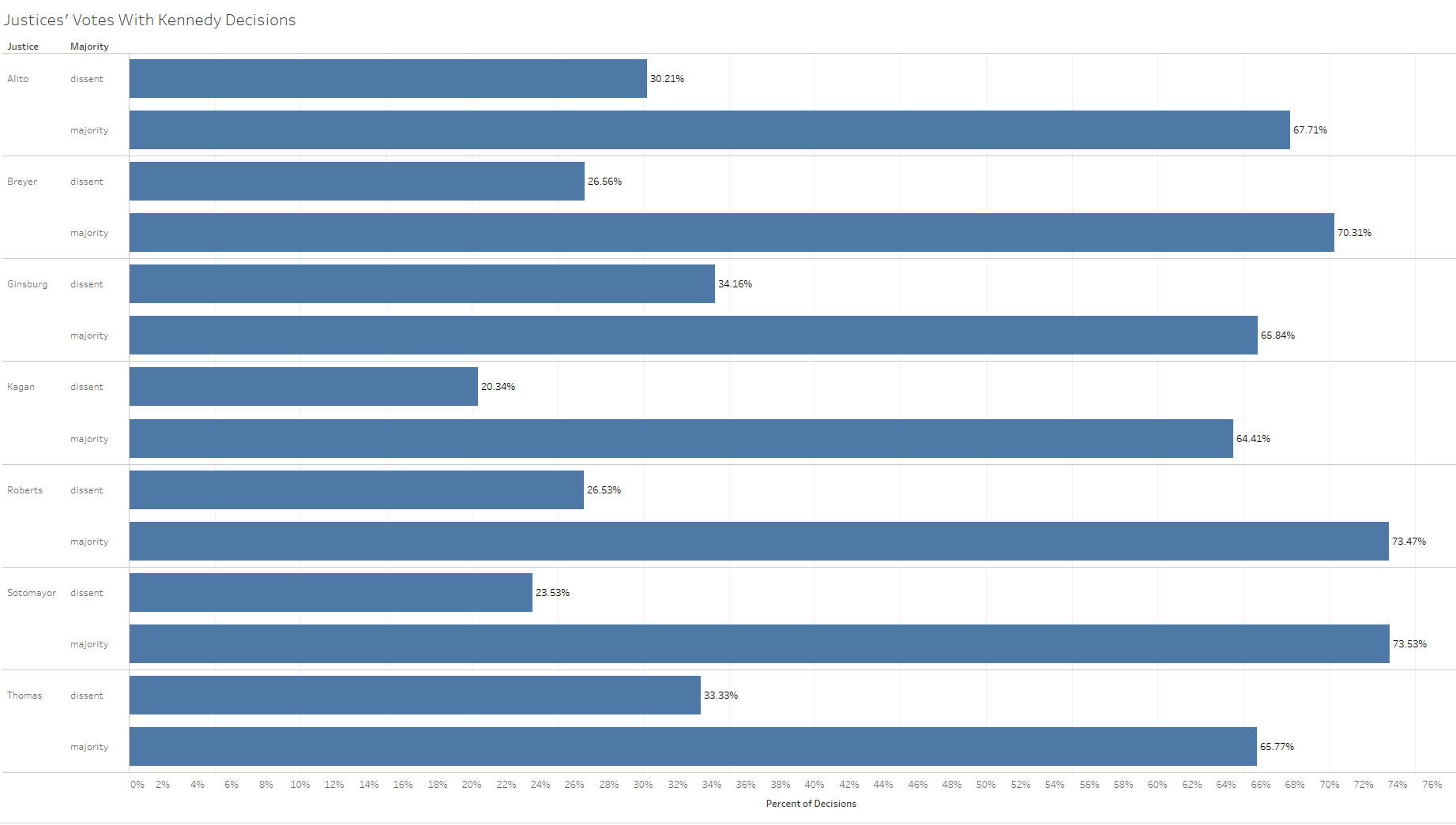 For the most part, Kennedy was in the majority more often with the liberal justices in recent terms than he was with the more conservative justices. This is especially evident in his shared frequencies in the majority with Kagan.
