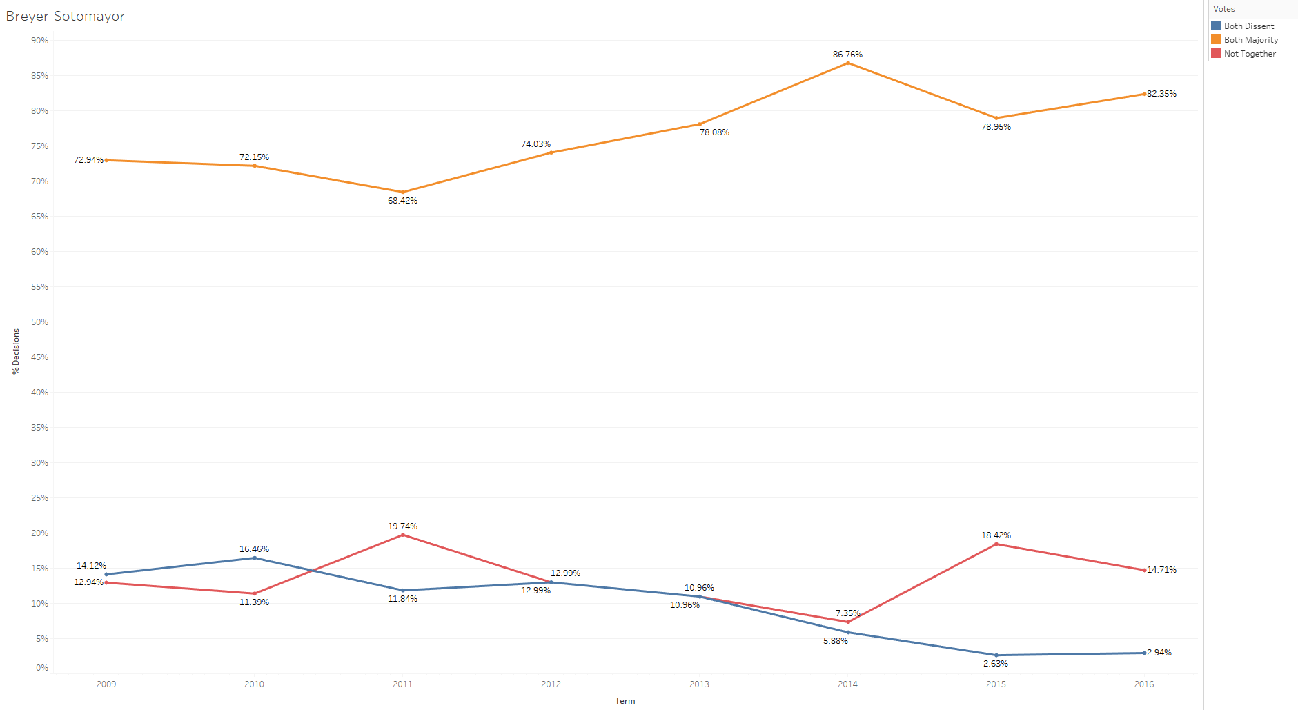 Ginsburg and Sotomayor have had a fairly high level of common dissents that has typically surpassed that of Breyer and Sotomayor.