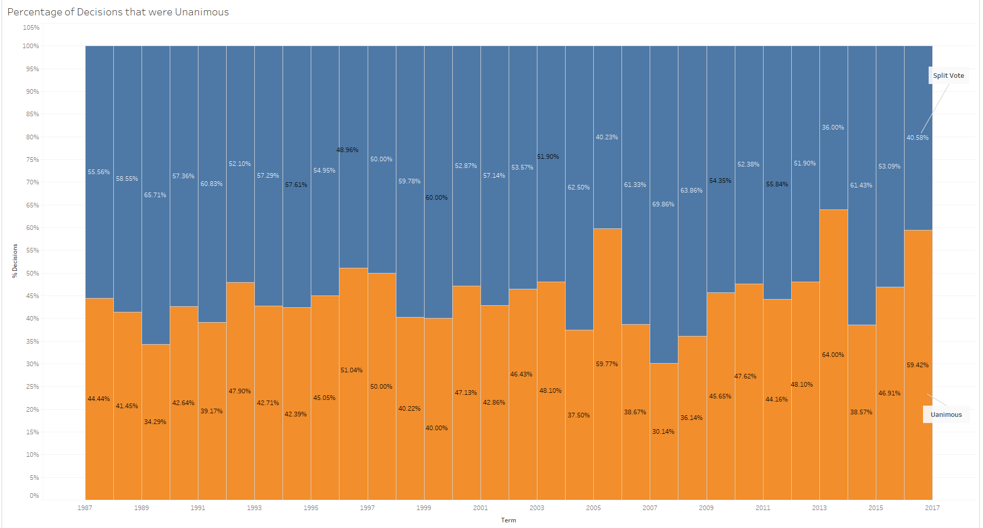 The average number of unanimous decisions since Kennedy joined the court in 1987 has been around 50 percent. It was highest in 2013 at 64 percent and lowest in 2007 at 30.14 percent. There appears to be a mildly upward trajectory in recent terms, although there is also a consistent year-to-year fluctuation in the data that has increased between recent terms.