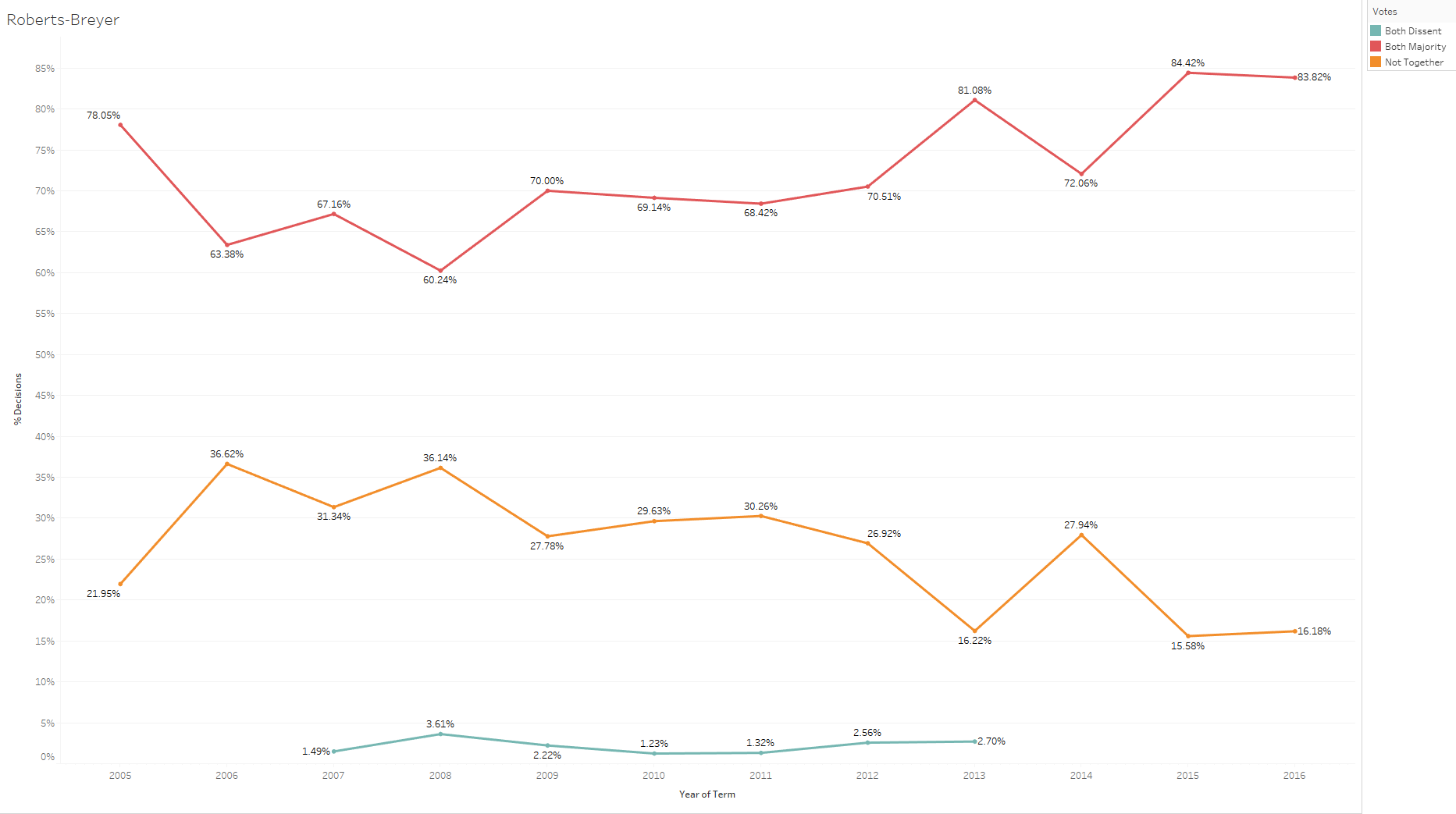 Although they infrequently dissent together, Breyer and Roberts also have a high rate of agreement in the majority. This rate falls below that of Roberts and Kagan just a bit, although this is another pair who should maintain positions in the court’s majority for many of the court’s future decisions.