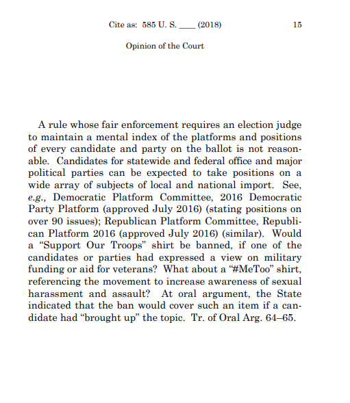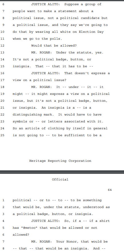In this example, as with many of the instances in which justices cite oral-argument transcripts, the authoring justice used the interaction to expose a weakness in a party’s argument. Roberts refers to the portion of the proceedings when several of the justices, most notably Justice Samuel Alito, engaged the respondents’ attorney Daniel Rogan about the extent of the apparel ban under the statute.