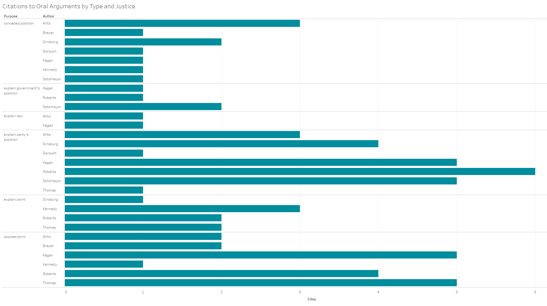 The most frequent purpose of oral-argument citations so far this term has been to convey a party’s position. Within this area Roberts is the most frequent citing justice, followed by Kagan and Sotomayor. The rationale for this type of citation is often to develop an argument against the party’s position.