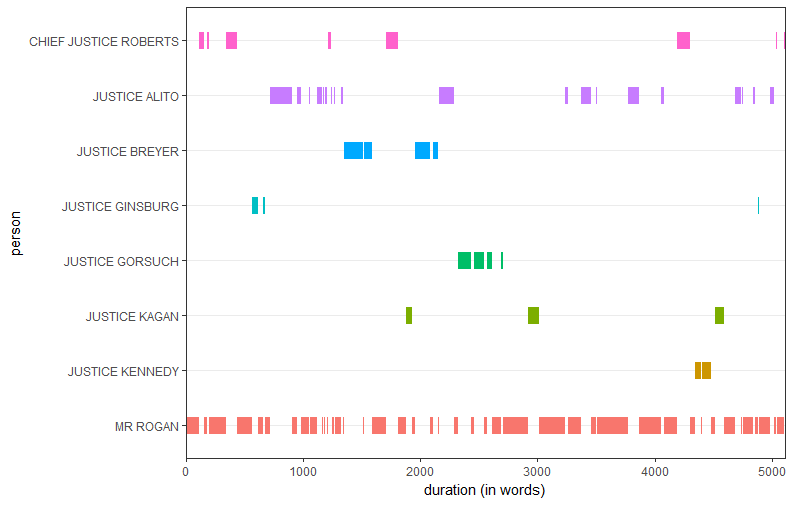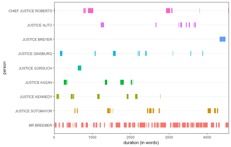 By breaking these figures down to their composite numbers, it becomes clear that Alito, Roberts and Justices Neil Gorsuch and Stephen Breyer spoke more during the respondents’ turn. Speaking more to one side is often correlated with voting against that side, and although Justice Clarence Thomas did not speak at oral argument, he generally agrees with coalitions that include Roberts, Alito and Gorsuch. This leads to the question of whether the oral argument in Mansky helped move Justices Ruth Bader Ginsburg, Anthony Kennedy and Elena Kagan to the majority. I will return to this question toward the end of the post.