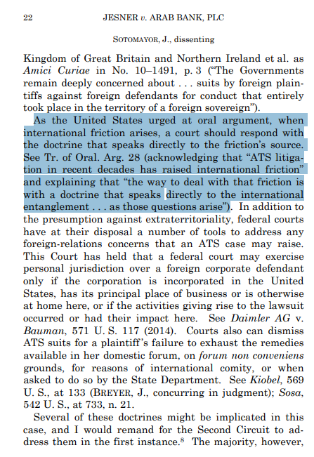 Arguments were also cited to explain the government’s positions, as in Justice Sonia Sotomayor’s opinion in Jesner v. Arab Bank, PLC: