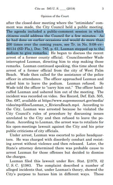The scenario as Kennedy described it included specific details, like the number of times Fane Lozman attended the city-council sessions. In this way, Kennedy set the stage for various interpretations of what Lozman’s regular attendance implies or, conversely, of the importance of the arrest on that particular occasion.