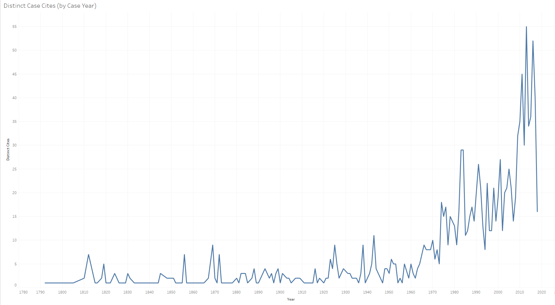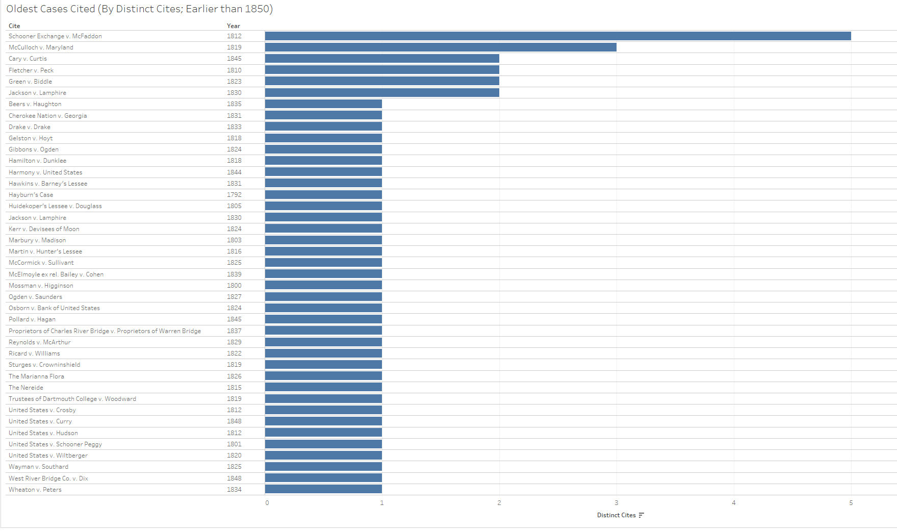 The following figure looks at the number of distinct cites to cases decided on or before 1850.