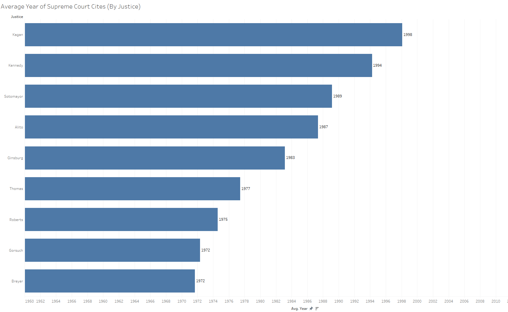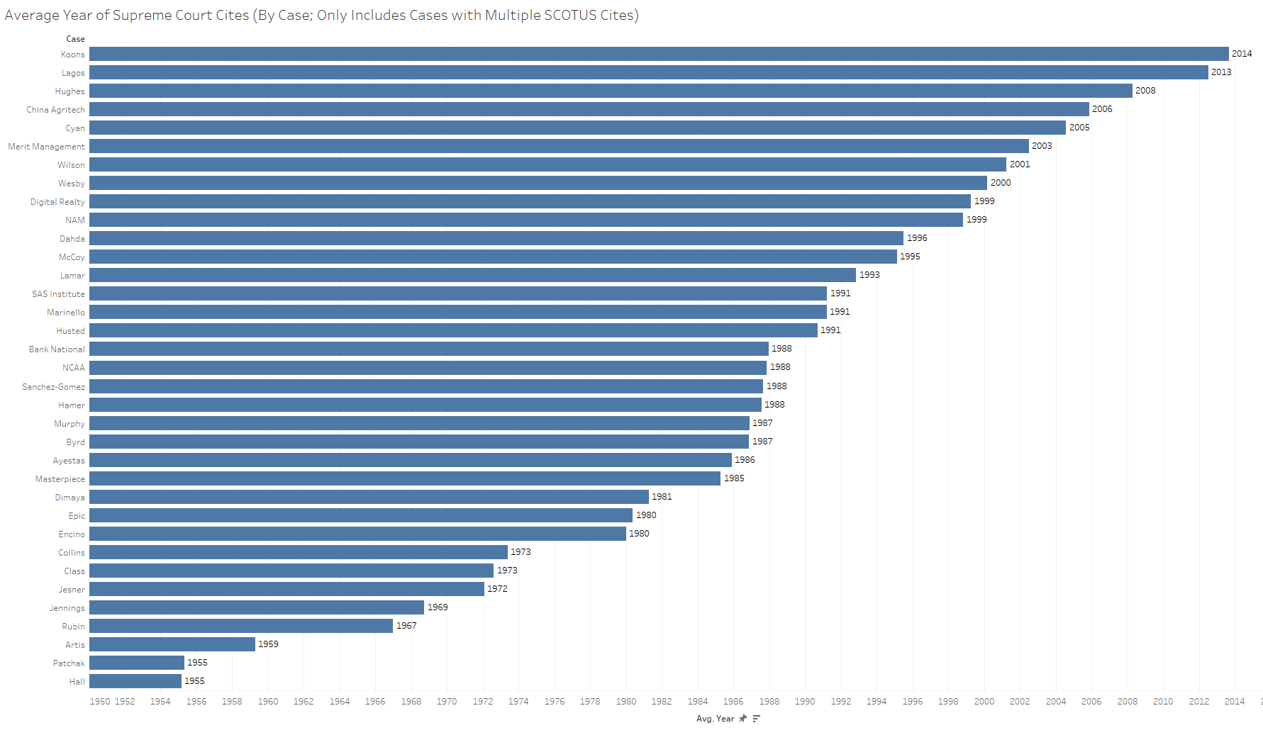 Expectations based on this graph may be that the court tends to cite more recent cases with greater frequency or that older cases that are cited must stand for particularly important positions. The choice of precedent by age is not always an entirely subjective decision, though, as the line of precedent related to individual cases might warrant or require the application of older or newer precedent. The distinctions at the case level are visible in the figure below, which shows the average decision year of Supreme Court cases cited in this term’s opinions.