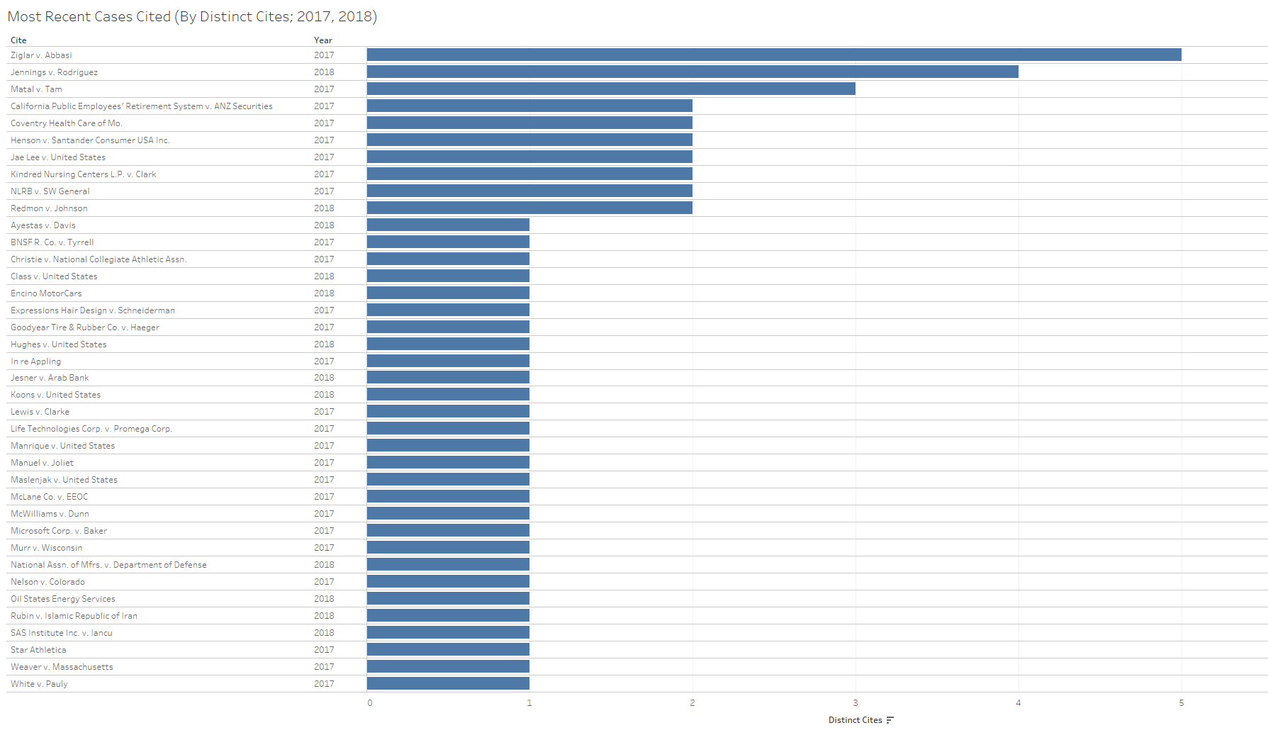 Justice Clarence Thomas’ dissenting opinion in Dimaya far out-cites all other opinions so far this term. The opinion with the next most distinct citations is Justice Ruth Bader Ginsburg’s dissent in Epic Systems Corp. v. Lewis. Interestingly, 25 opinions so far this term have included at least 25 distinct citations.