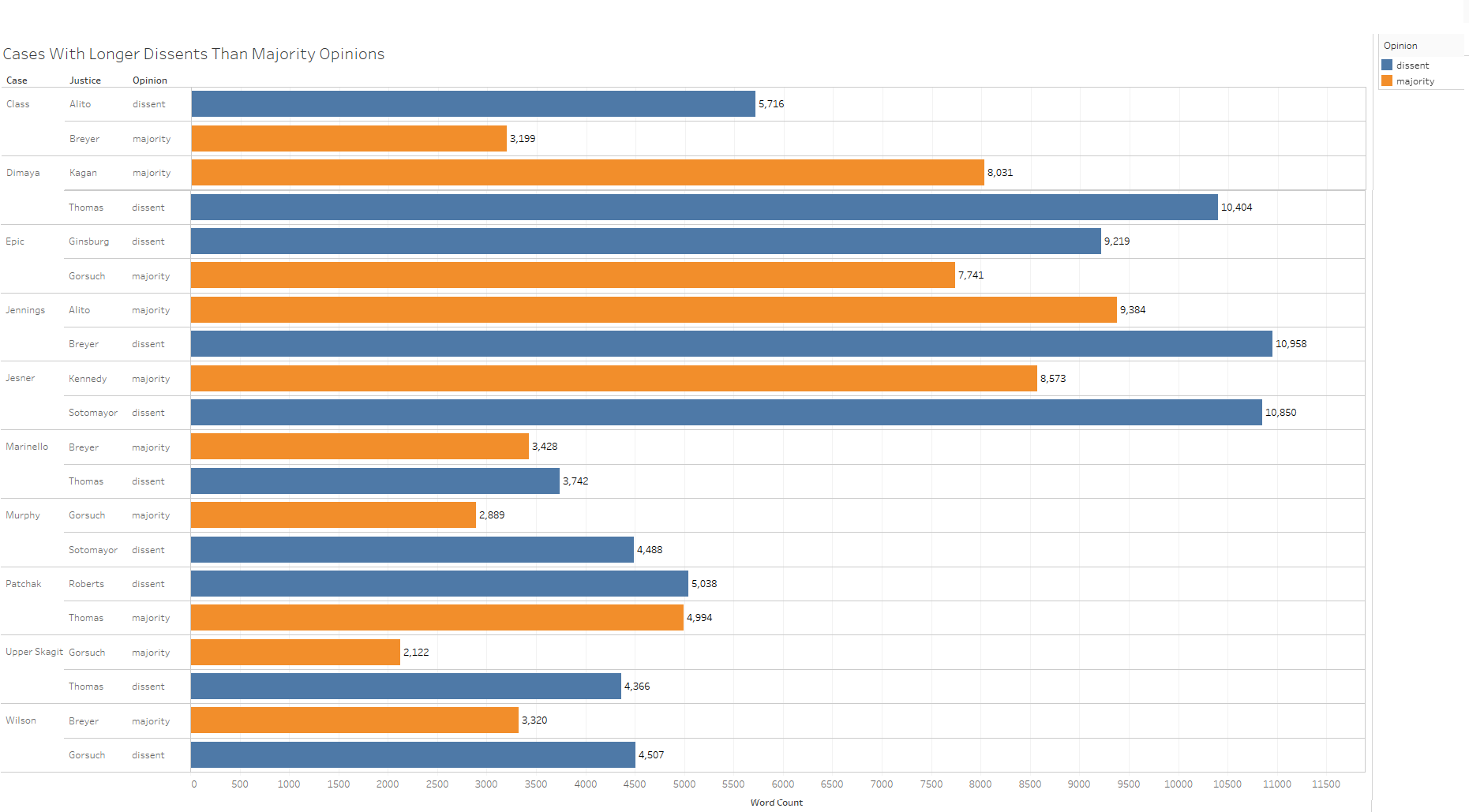 Alito’s concern over length is a bit perplexing, because his majority opinion is almost 500 words longer than Breyer’s dissent (The lengths of both are shown in the first figure.). Conversely, in 10 instances or over a quarter of the decisions so far this term, a dissenting opinion has been lengthier than the majority opinion. Those instances are shown next.