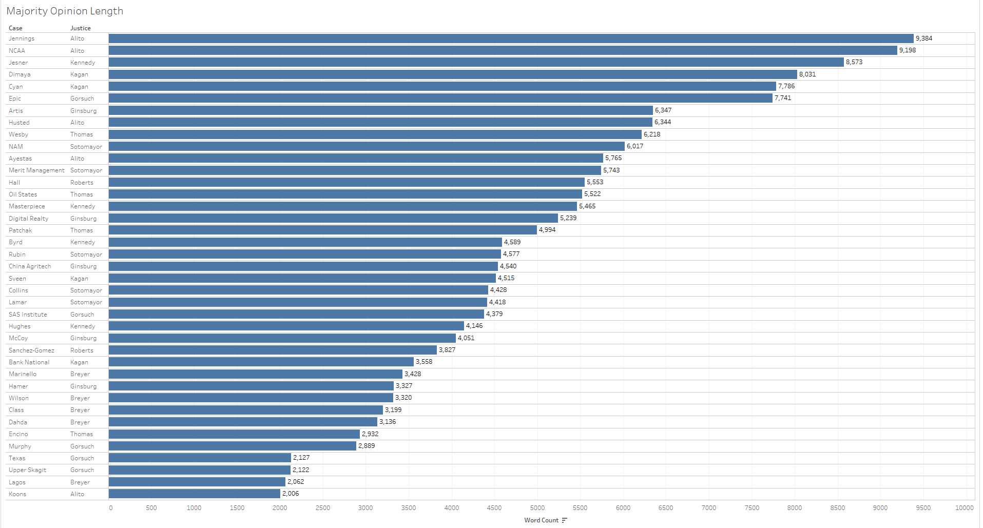 Alito, for instance, not only wrote the longest majority opinion in Jennings and the second longest in Murphy v. National Collegiate Athletic Association, but he also wrote the shortest majority opinion in Koons v. United States. Justice Elena Kagan, who has authored some of the lengthiest opinions in recent terms, authored the fourth and fifth longest majority opinions so far this term with Sessions v. Dimaya and Cyan Inc. v. Beaver County Employees Retirement Fund. The highly anticipated decision in Masterpiece Cakeshop v. Colorado Civil Rights Commission turned out to fall in the middle of opinion length so far this term with 5,465 words.