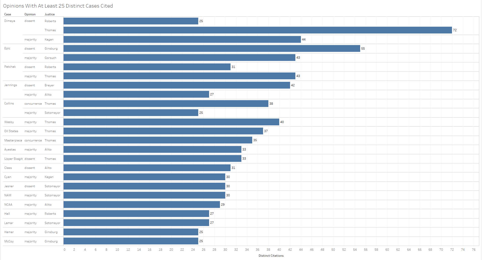 Thomas not only cited the most distinct cases in Dimaya, but also cited the most distinct cases in the aggregate so far this term by a large margin.