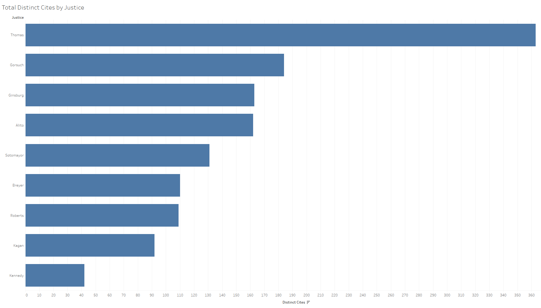The extent of the difference in cite counts between Thomas and the rest of the justices connotes the possibility that he has more detailed legal analyses in his opinions this term, although, like most justices, Thomas uses many of his citations as support for positions and does not analyze them in great depth. This count data still do likely present an important gauge of relative clerk workload.