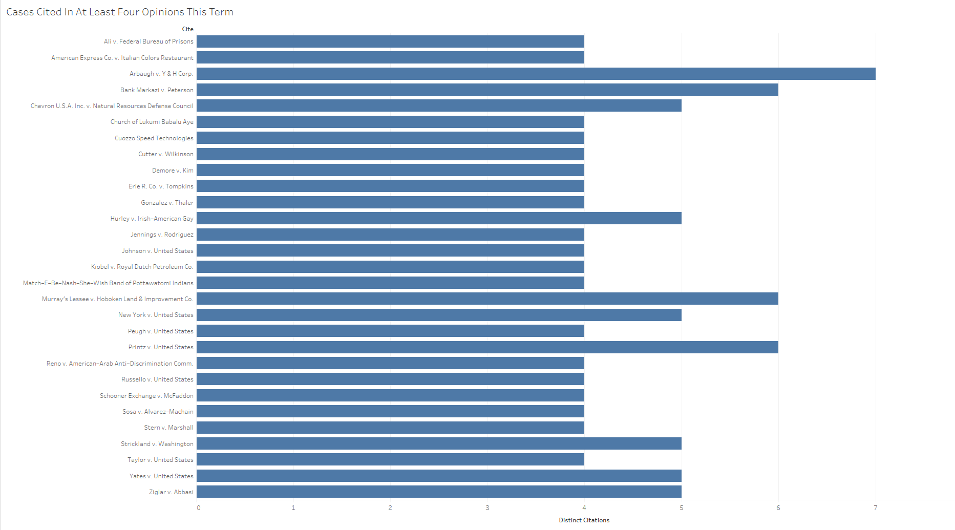 We can also turn this around a bit and look at the cases that have been distinctly cited most often this term.