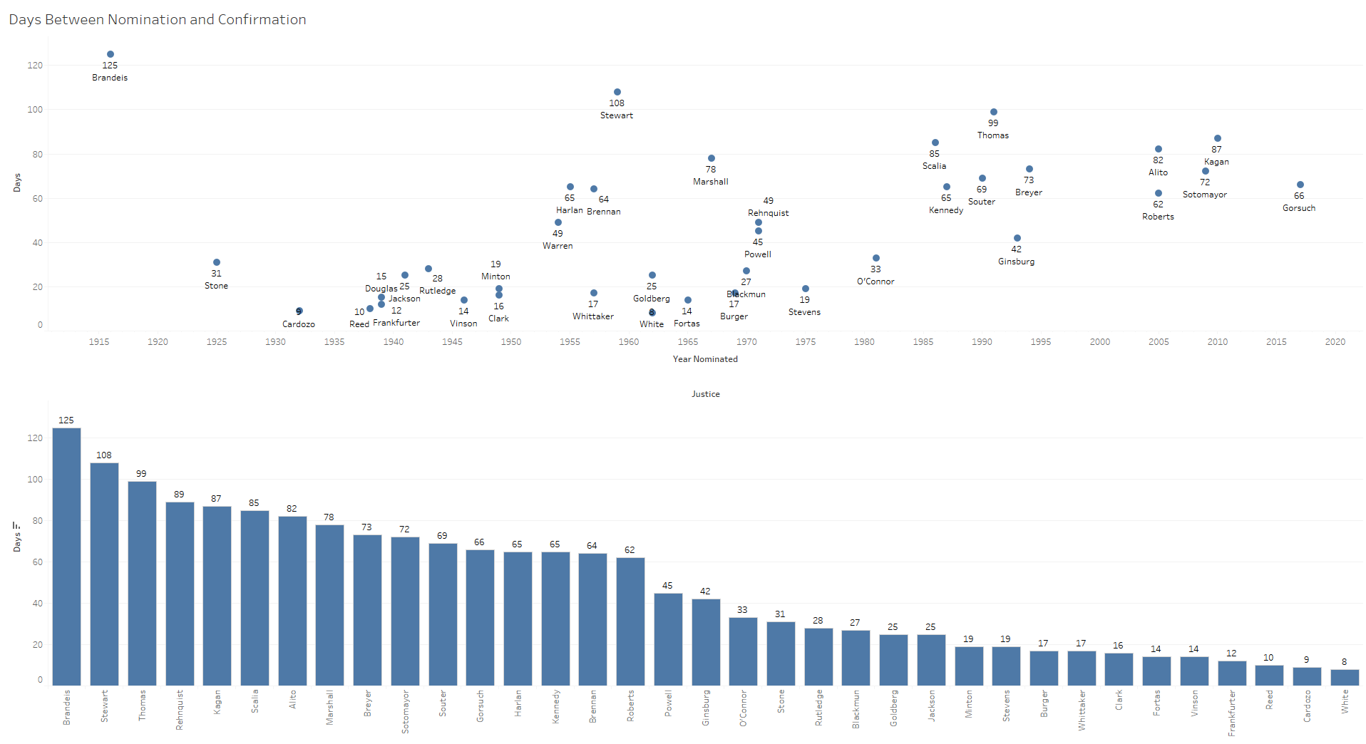 Garland’s nomination changed the terrain surrounding confirmation battles once again, as his nomination sat pending for 294 days, a modern record, before it expired in January 2017. The average time between a nomination and a final action in the Senate across the last several nominations was much closer to two months (N.B., the following figures were constructed with the aid of data from the Supreme Court Justices Database). Here are the times between nomination and confirmation for all confirmed nominees who had a hearing before the Senate Committee on the Judiciary.