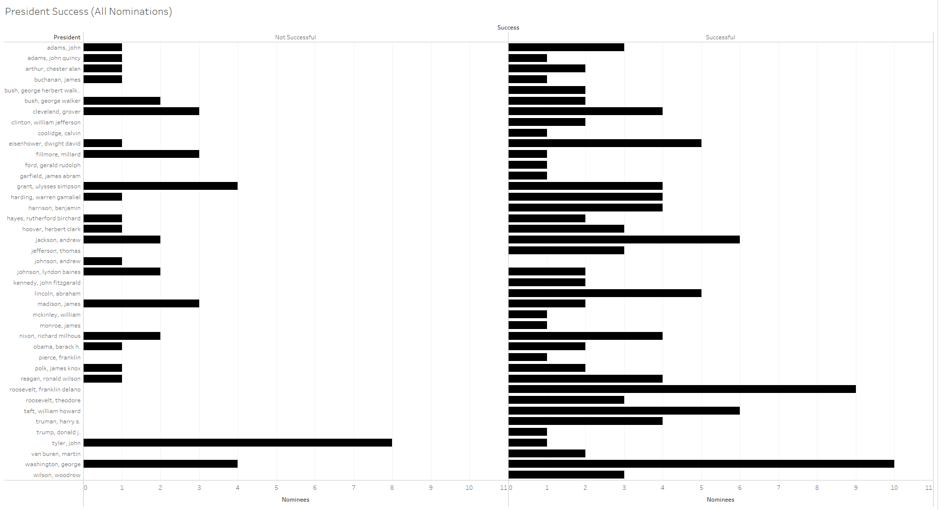 We can also look more granularly and focus on success by president. This not only accounts for party affiliation and the reputation of the nominee but also the reputation of the president and the relationship between the president and Senate.