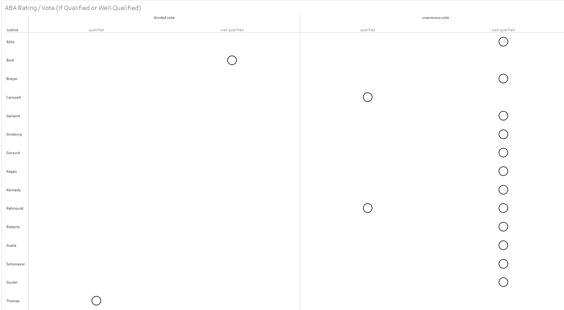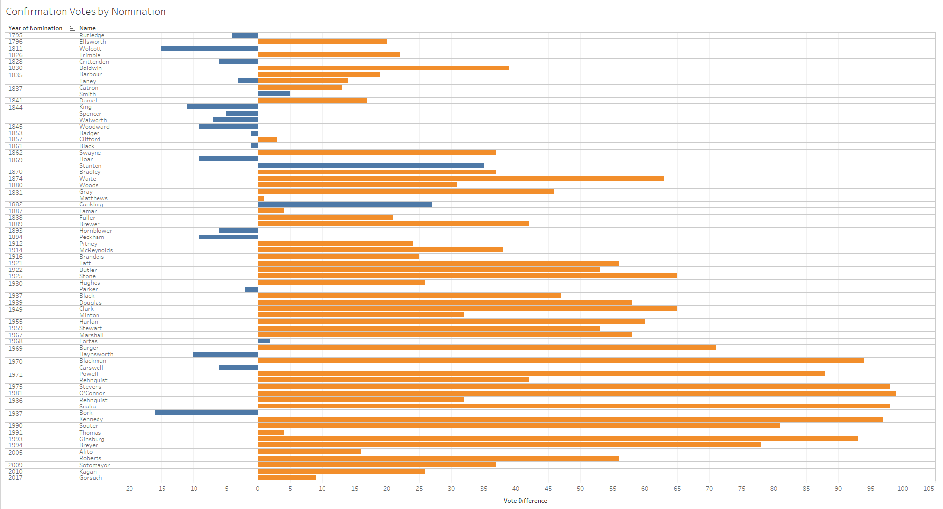 Since 1975, Bork was the only nominee who made it to the Senate hearing and was not confirmed. Going back to 1900, only 10 nominated individuals were not later confirmed. Across the history of the Supreme Court, the votes for nominees were overwhelmingly favorable. When organized from most net votes to fewest, the confirmation votes look as follows.