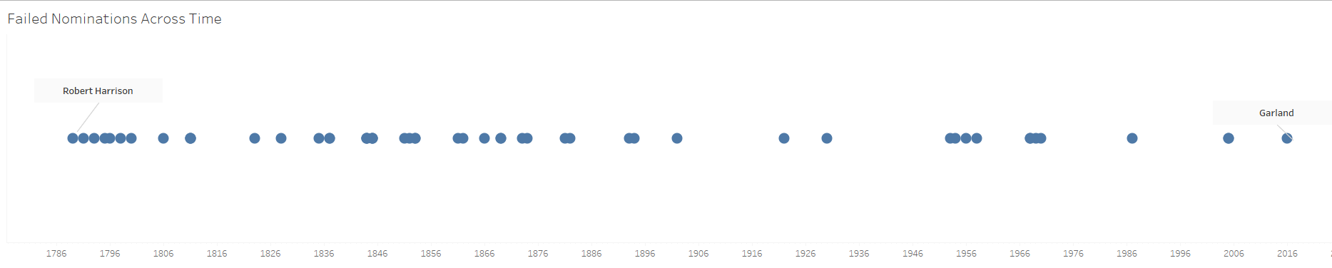 Failed nominations have been fairly evenly distributed over the years, although the bulk were in the court’s earlier history, as the following figure shows.
