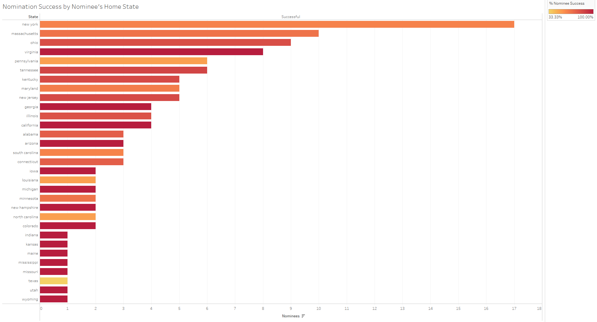 Confirmation success is related to a multitude of other factors along with ABA qualification ratings. Clusters of nominees, for instance, came from similar home states — most of them from New York. Nominees have not been equally successful, though, from all geographic locales.