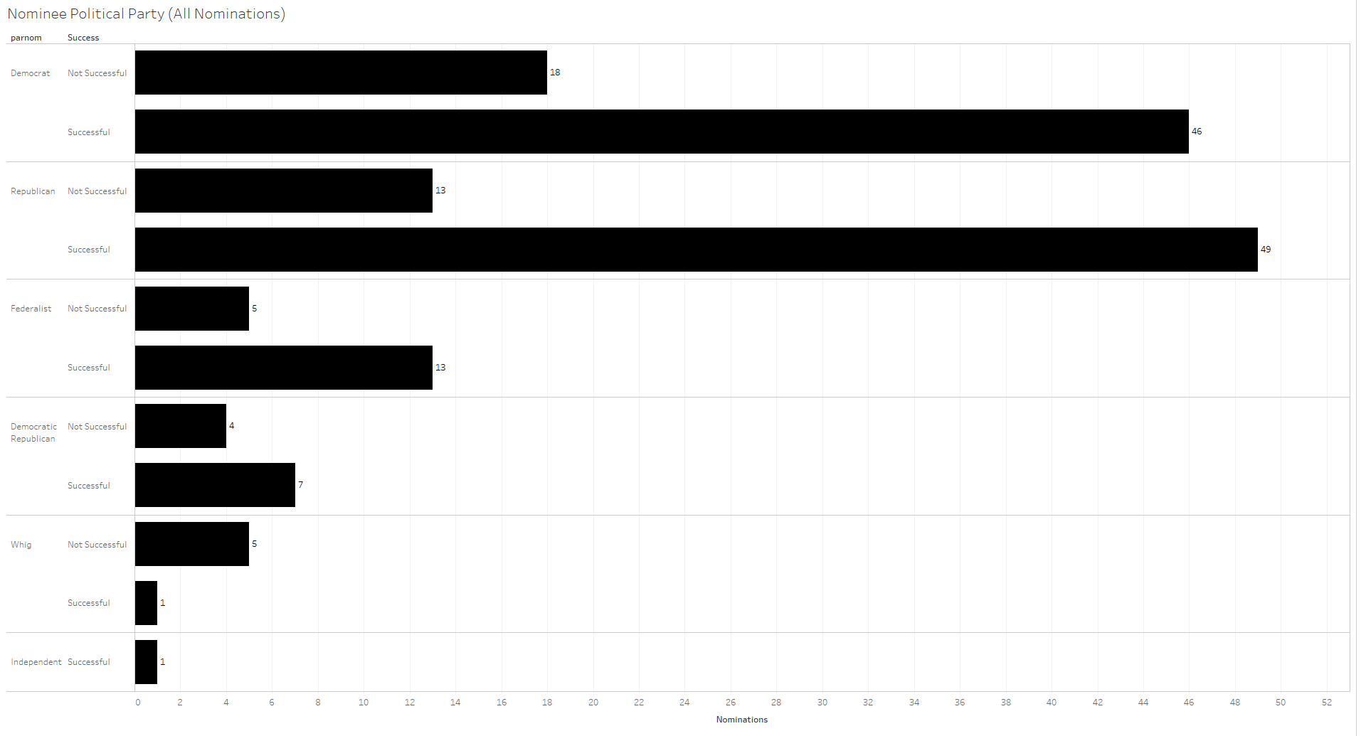 We can also examine the success of nominees by their party affiliation. When nominees are divided by their last party affiliation, some interesting differences become apparent.