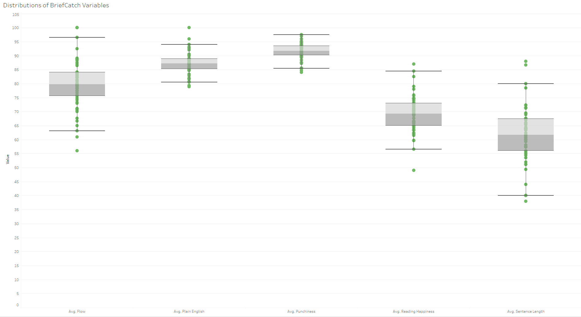 BriefCatch’s scores run from zero to 100 for the five measures, which are Flow, Plain English, Punchiness, Reading Happiness and Sentence Length. To get a sense of how briefs performed on these individual measures, the first figure shows box-plot distributions for each score. Box plots show the median score (the middle of the box) along with the distribution of scores around the median. Each dot reflects an individual brief’s score.