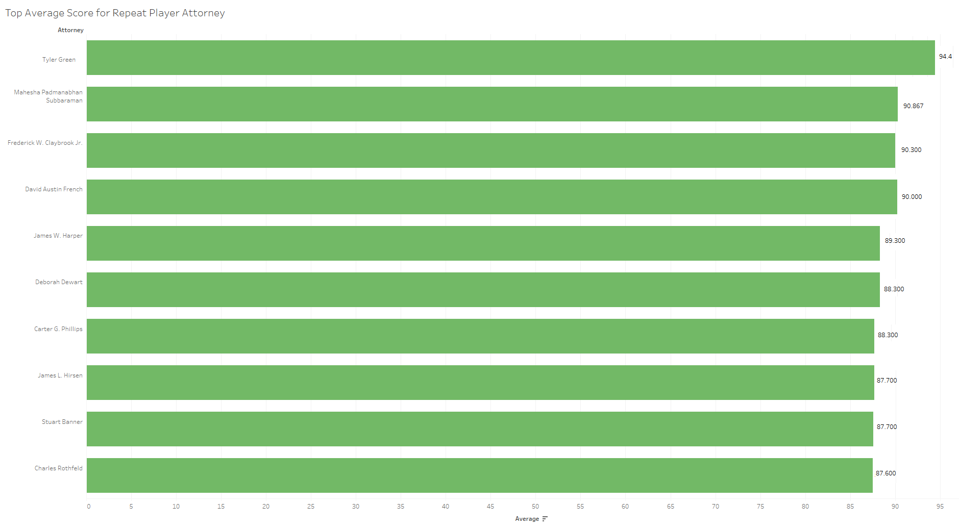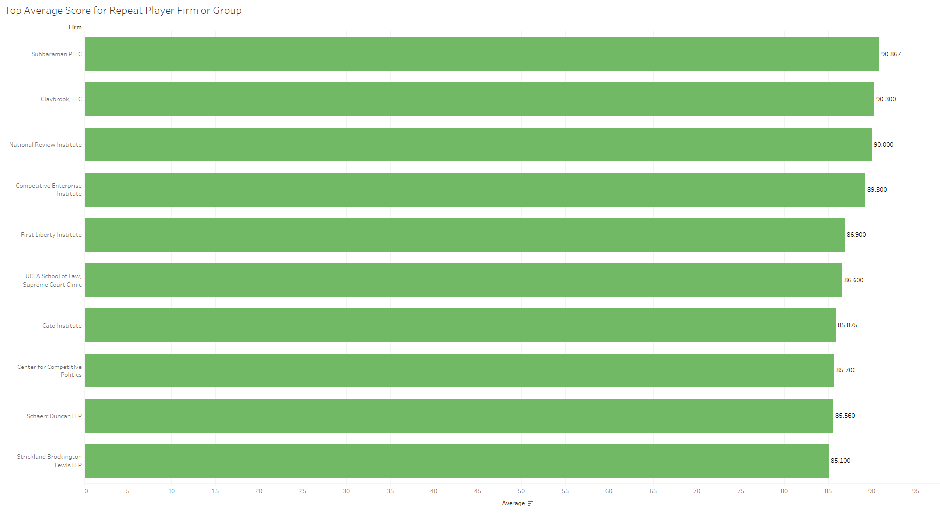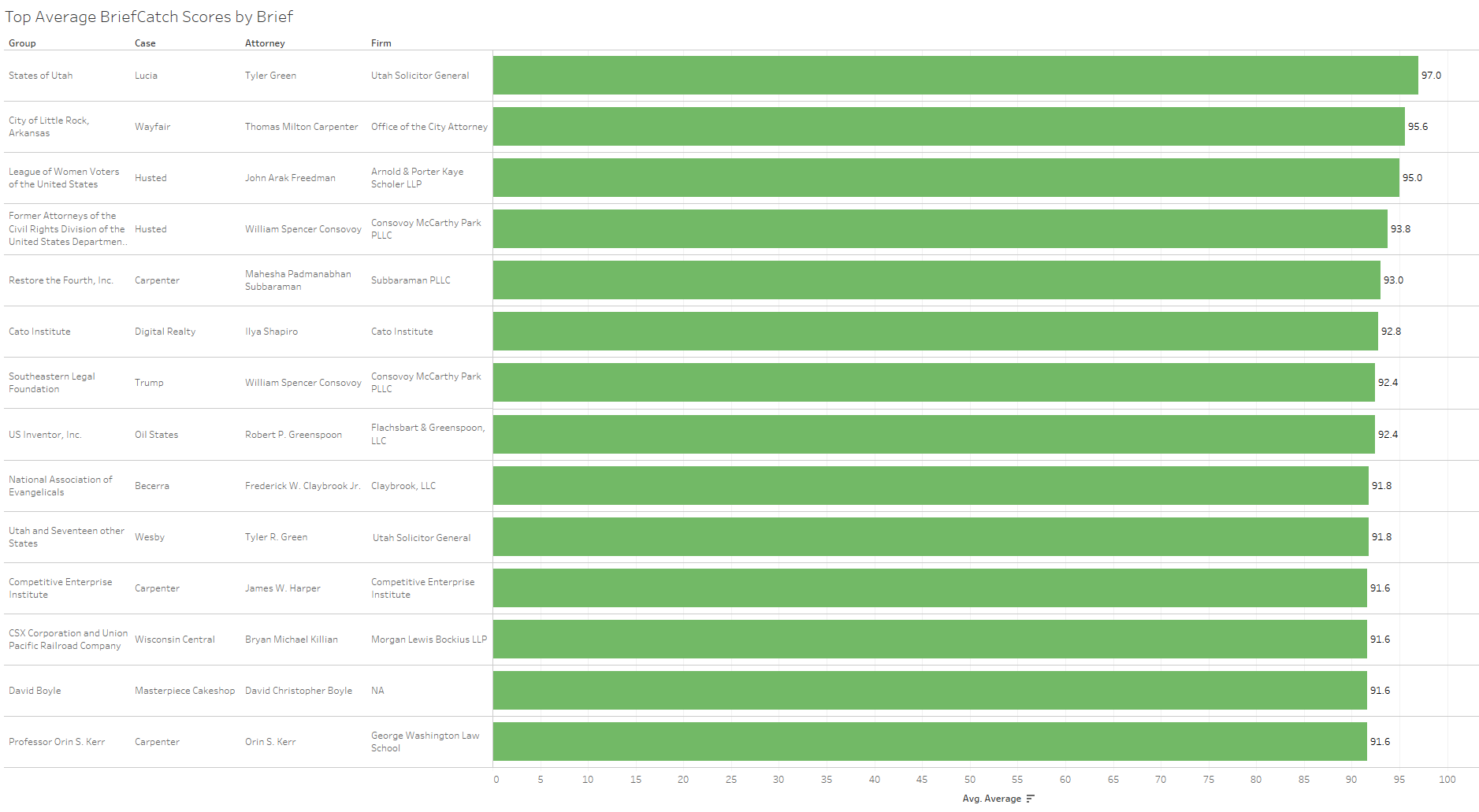 Next, these average scores by case are disaggregated into individual briefs’ scores. The following figure shows the top-ranked briefs from the term. All of these briefs had average scores greater than 91.5 and, referring back to the previous figure, fall to the right edge of the distribution.