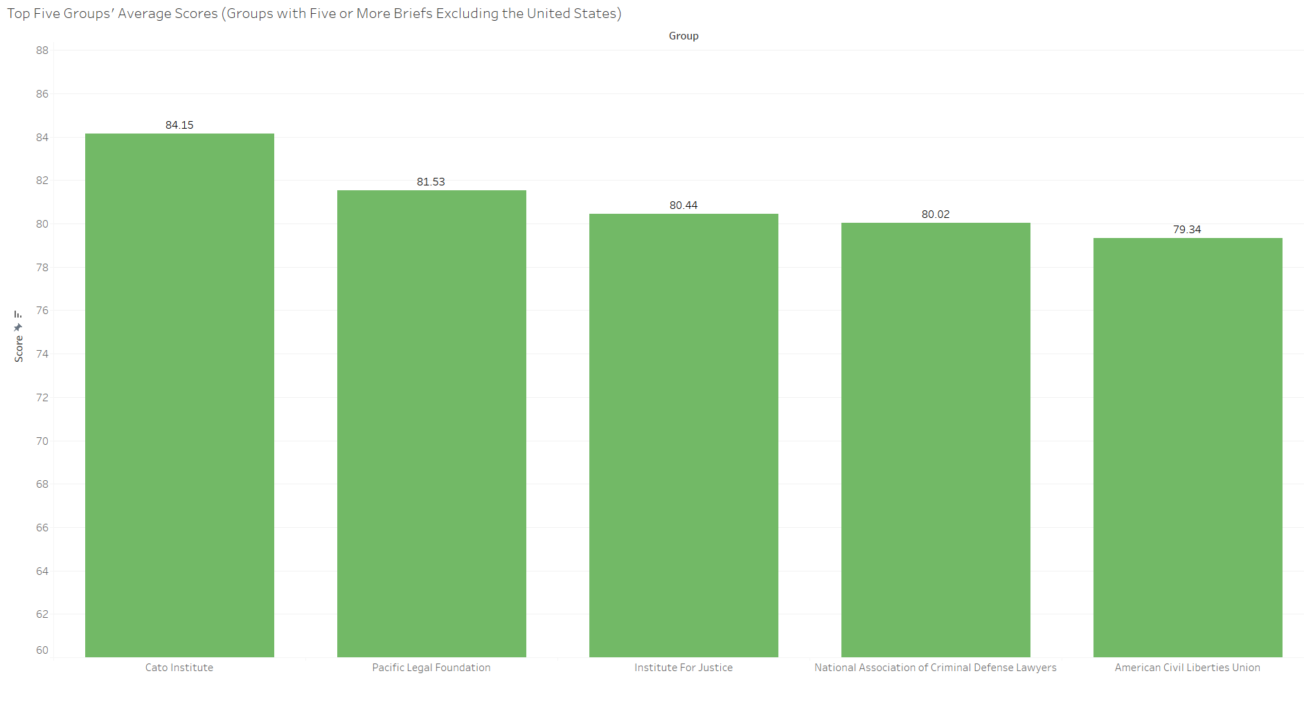 The Cato Institute, which was one of the top-ranked amicus firms, was the top-ranked group overall for the term. The second-best-faring group was the Pacific Legal Foundation, followed by the Institute for Justice, the National Association of Criminal Defense Lawyers and the ACLU. The range for all five of these groups’ composite scores is less than five points, indicating that the scores at the top are tightly packed compared to the range of scores conveyed by the total distribution.
