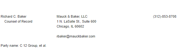 To the right of the attorney is the attorney’s law firm or place of practice, Mauck & Baker in this instance, and below is the name of the group on whose behalf the brief was filed, here C 12 Group, et al. The docket usually contains the name of the first listed firm and group and tends not to include multiple entities even if they appear on the brief itself.