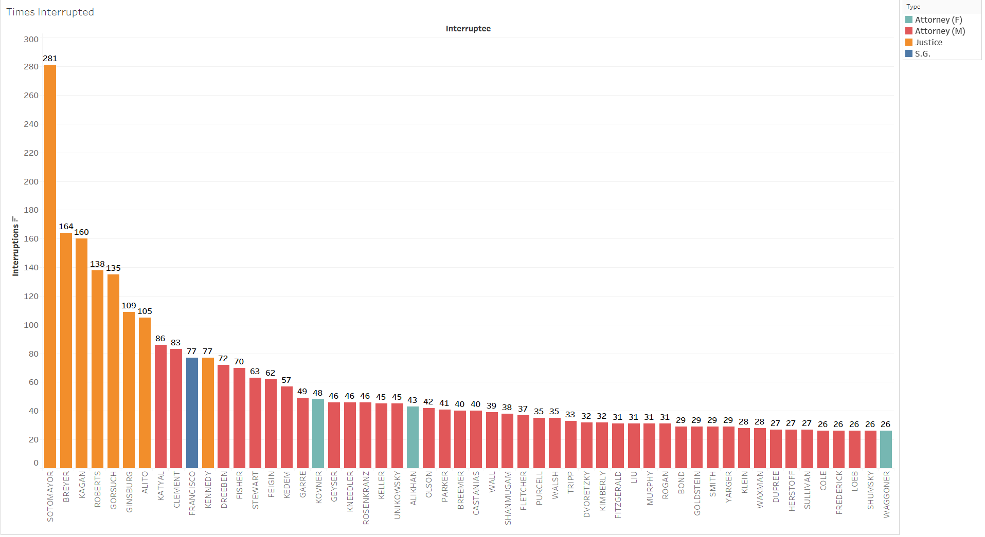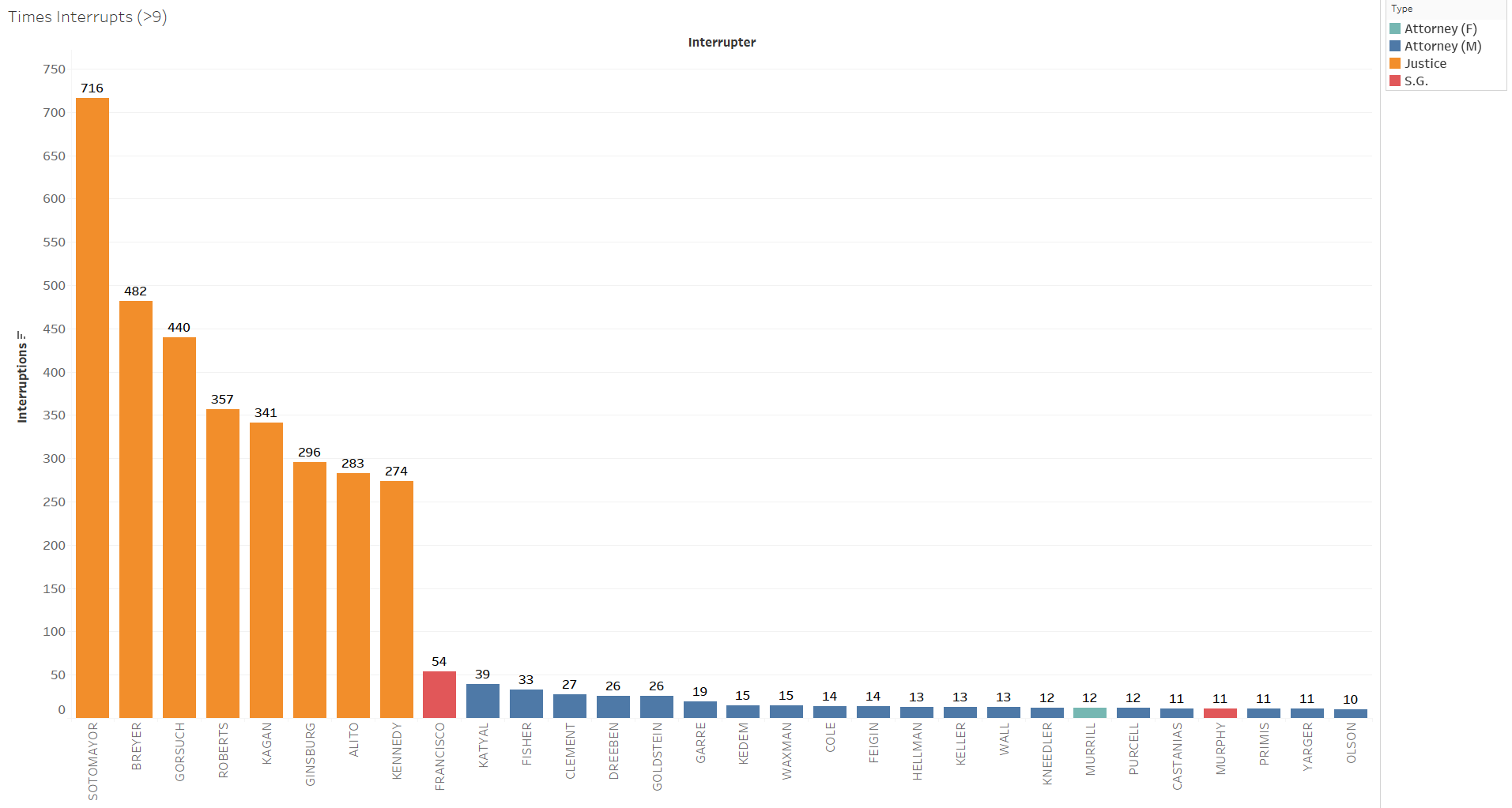 One possible explanation for the high number of times Sotomayor was interrupted might relate to the number of times she interrupted others. The next figure looks at the total number of times justices and attorneys interrupted others this term.