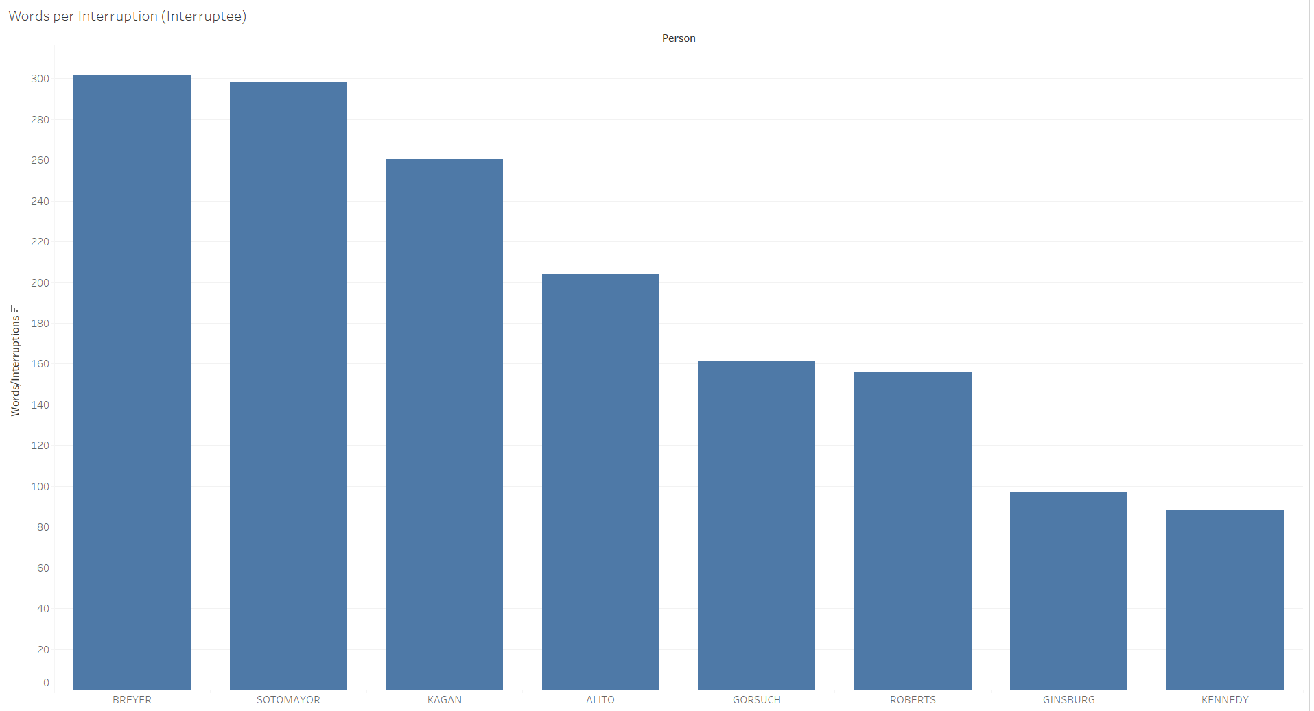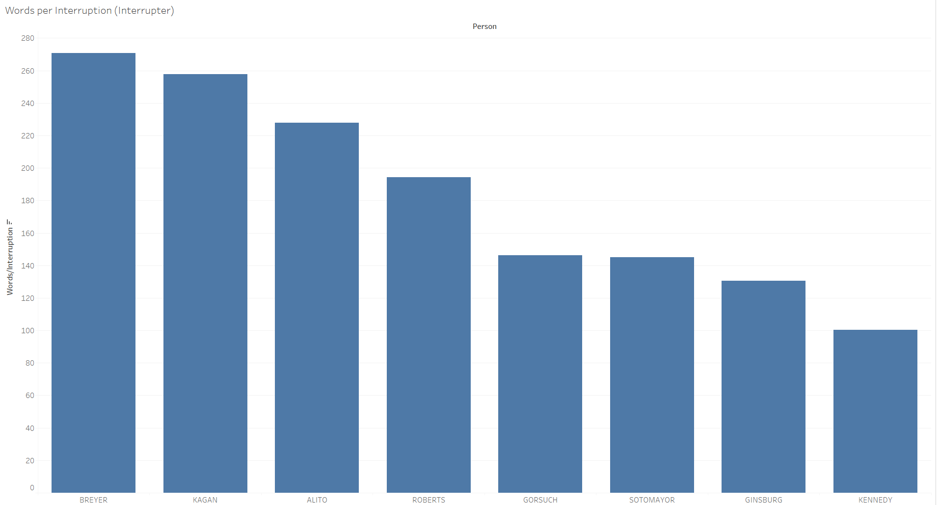 The other side of the coin tells a similar tale. When looking at the justices’ words per interruption while focusing on justices as interrupters, we get the following figure: