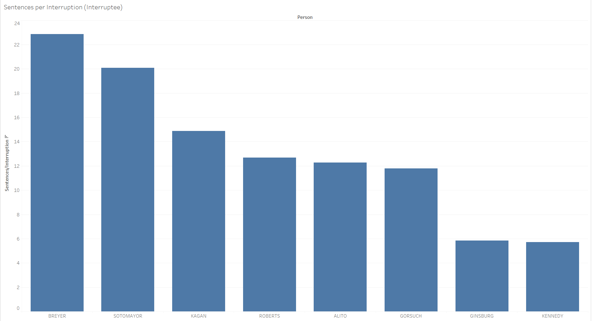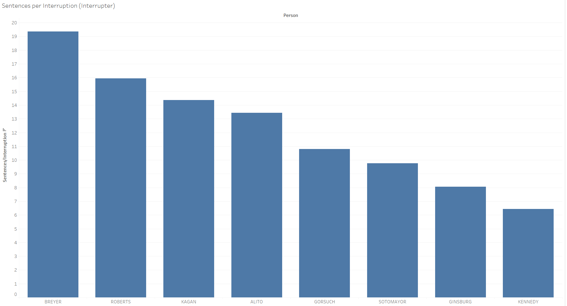 Breyer still comes in first with most sentences spoken per interruption. The only changes of the ordering of justices from the words-per-interruption figure pertain to Roberts, Gorsuch and Alito in the middle.