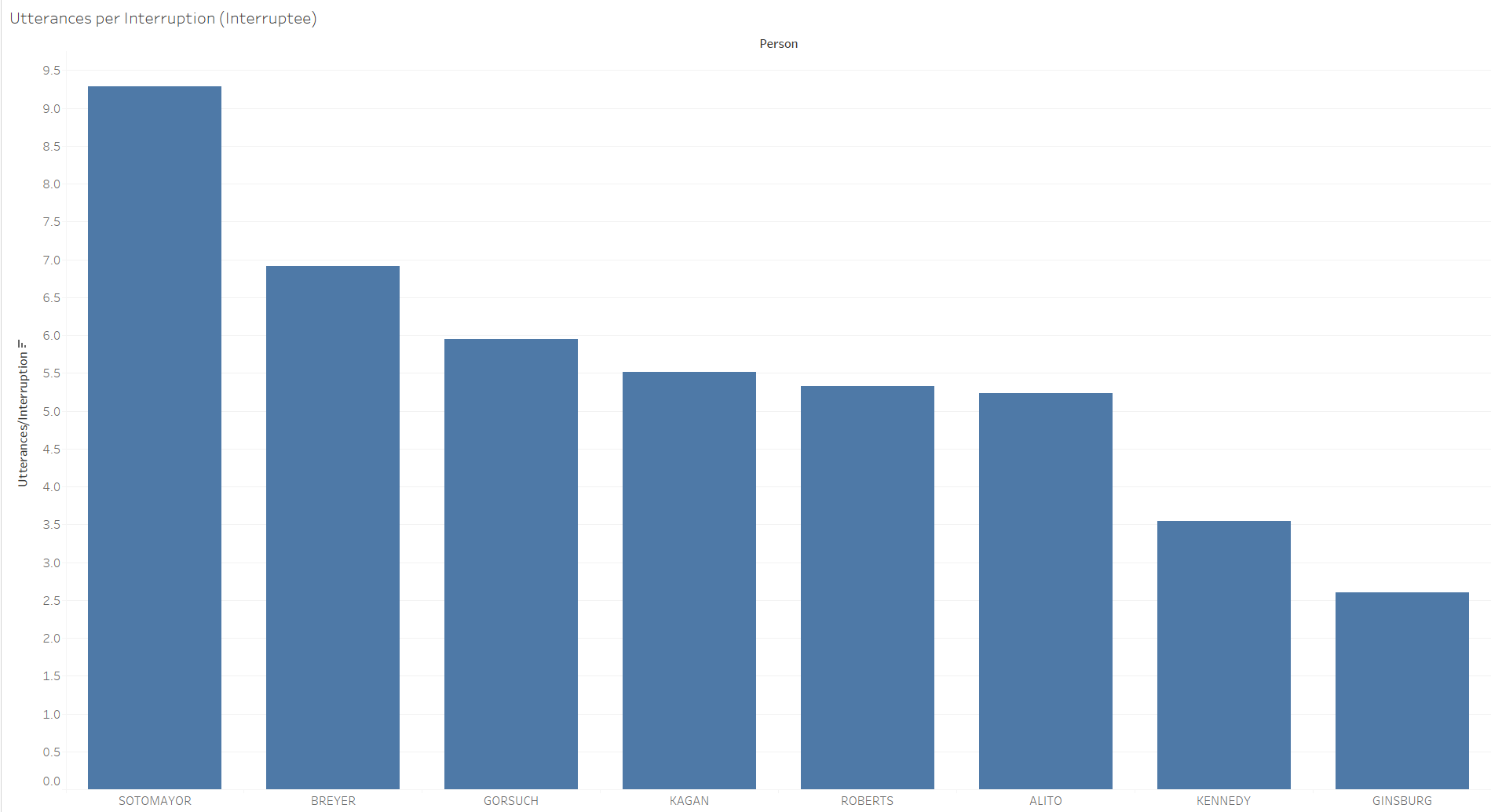 Sotomayor actually had more utterances per interruption than any of the other justices. Breyer was the second least interrupted justice according to this measure and Kagan was third. Ginsburg was interrupted most frequently when looking at utterances per interruption, with Kennedy coming in as the next most frequently interrupted justice.